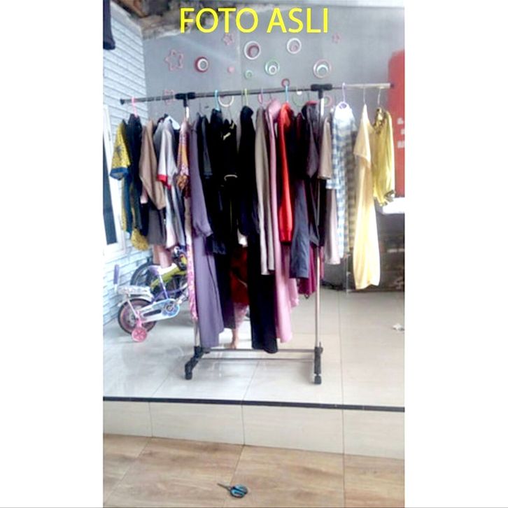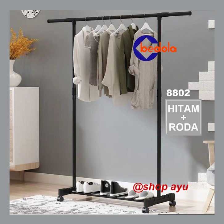 Bedola Stand hanger single hitam rak gantungan baju serbaguna dengan 4 roda