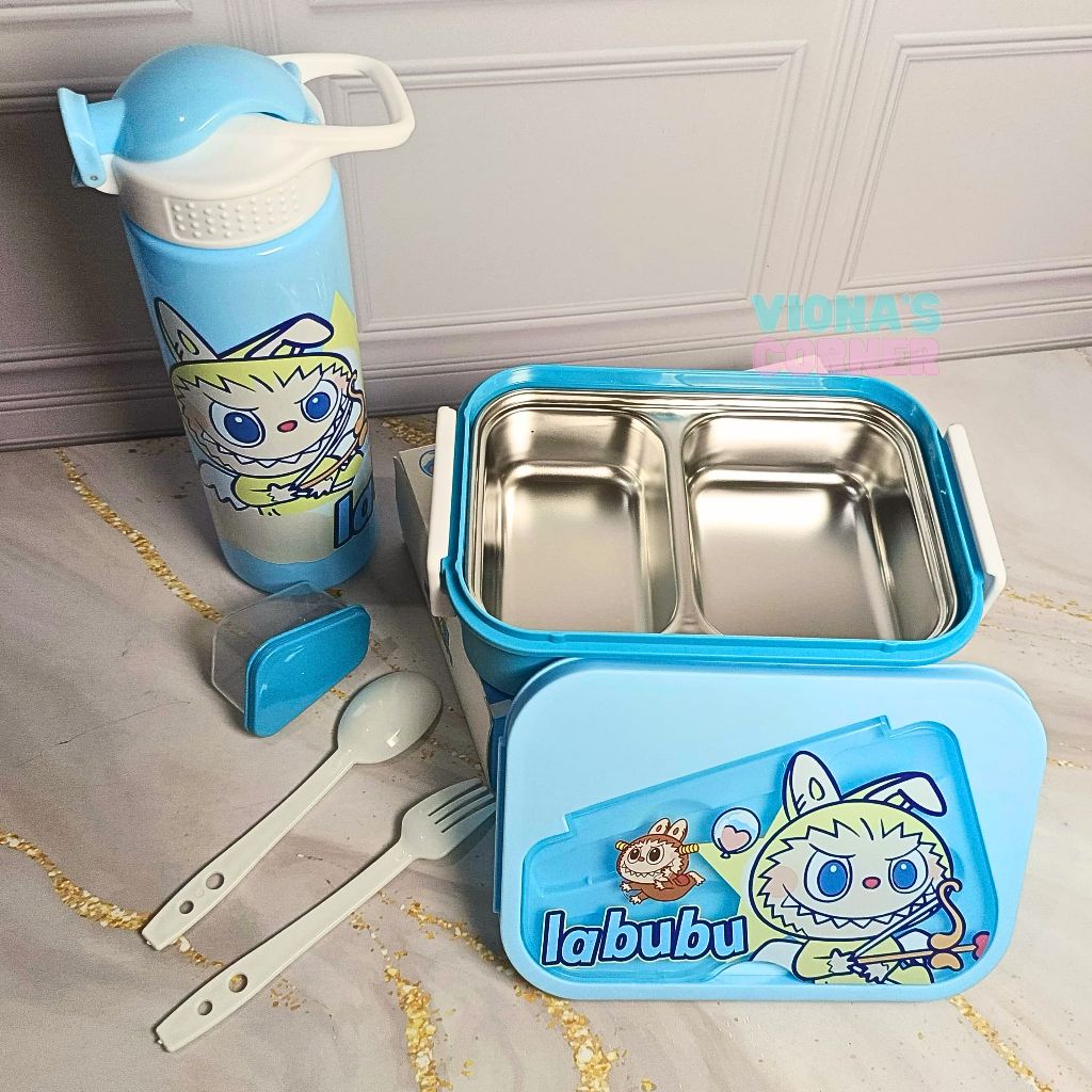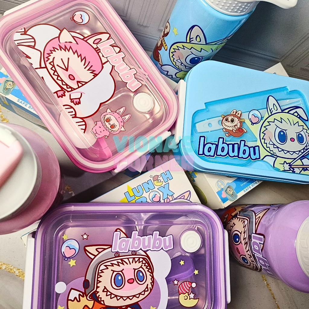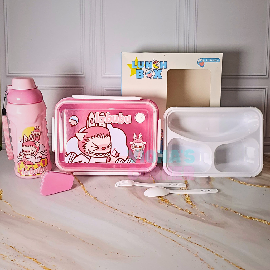 Lunch Box Set Labubu + Botol Minum Kotak Bekal 3 4 Sekat Pink Kotak Makan Luch Tempat Minum BPA Free