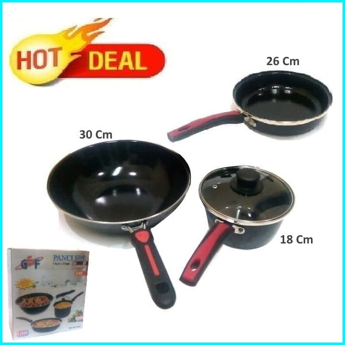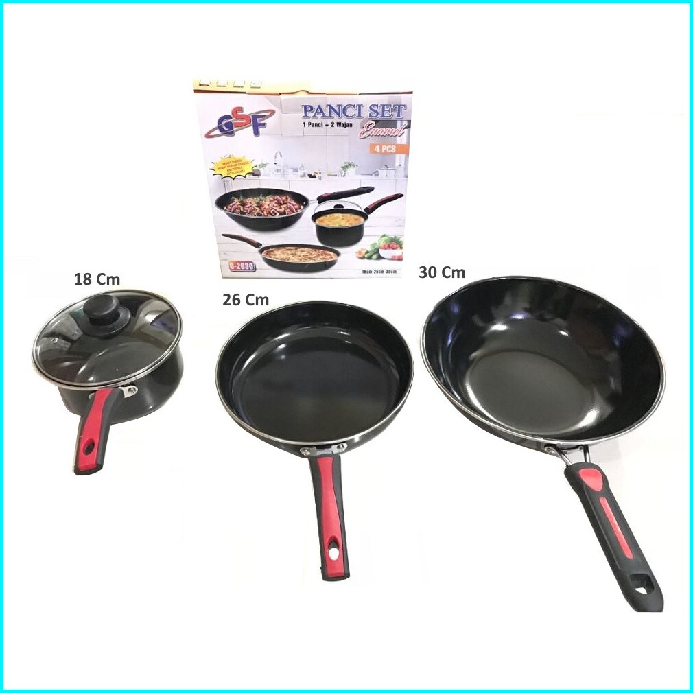 Panci Set Enamel Gsf G-2630 Frypan Tutup Kaca Wajan Wok Dan Saucepan
