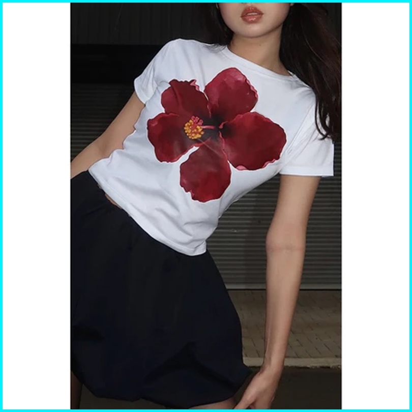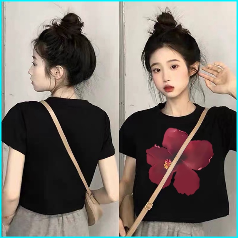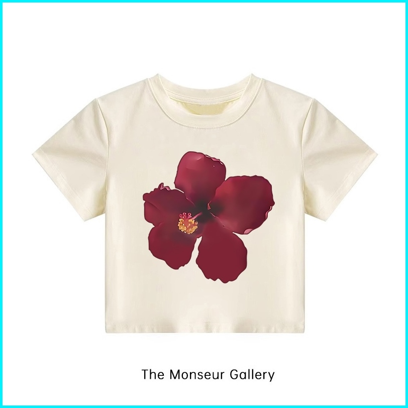 The Monseur Gallery Kaos Crop Wanita Slimfit Flower Design Hibiscus Orchid Kaos Crop Top Y2k Fashion Baju Croptee Hitam