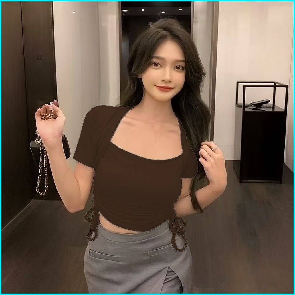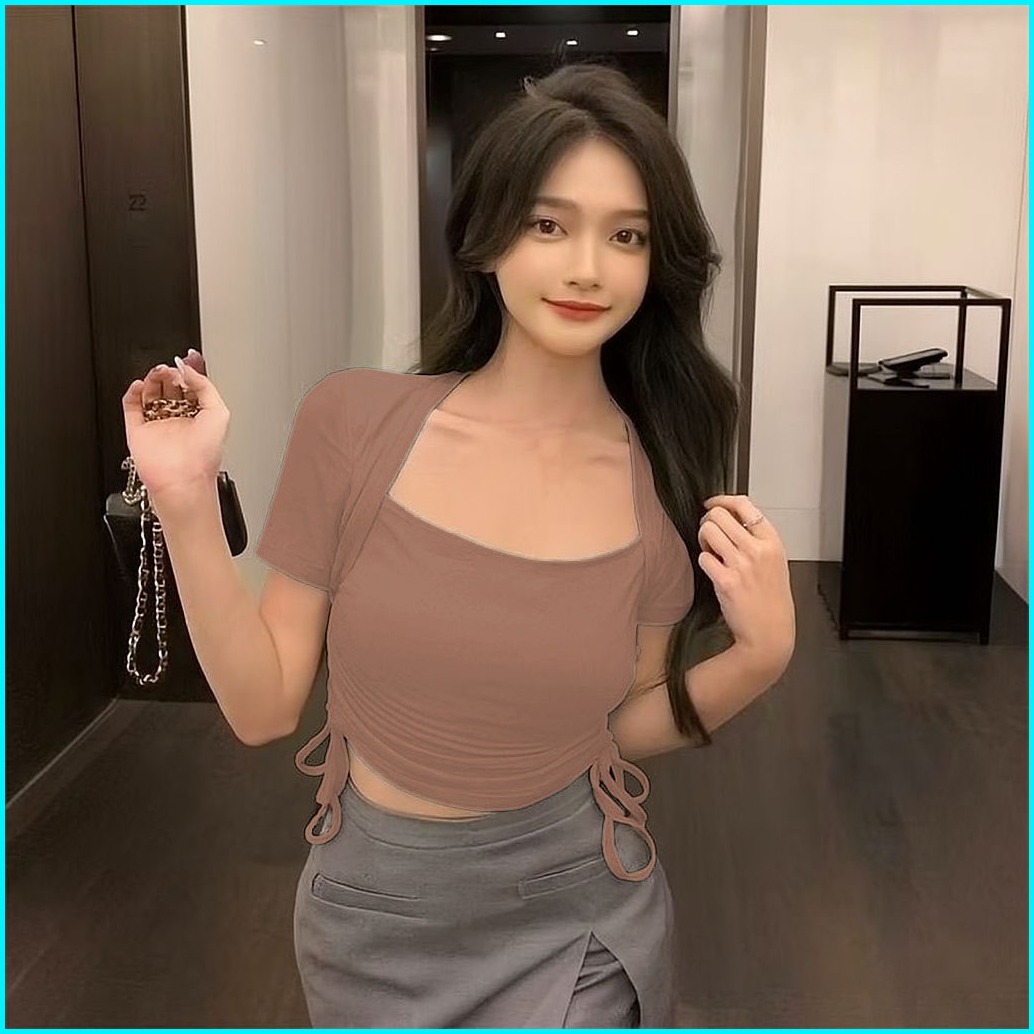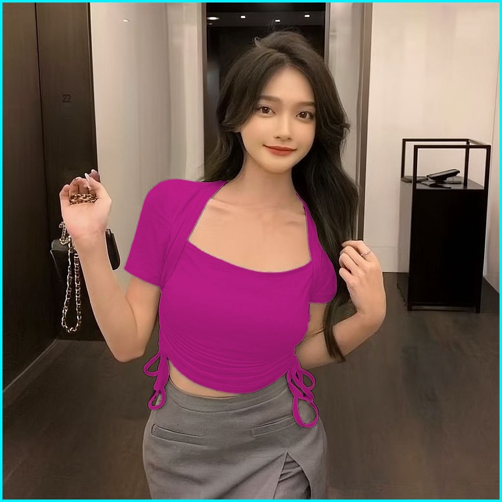Crop Top Serut Lengan Pendek Wanita - Atasan Kaos Wanita Fashion Korea 6046