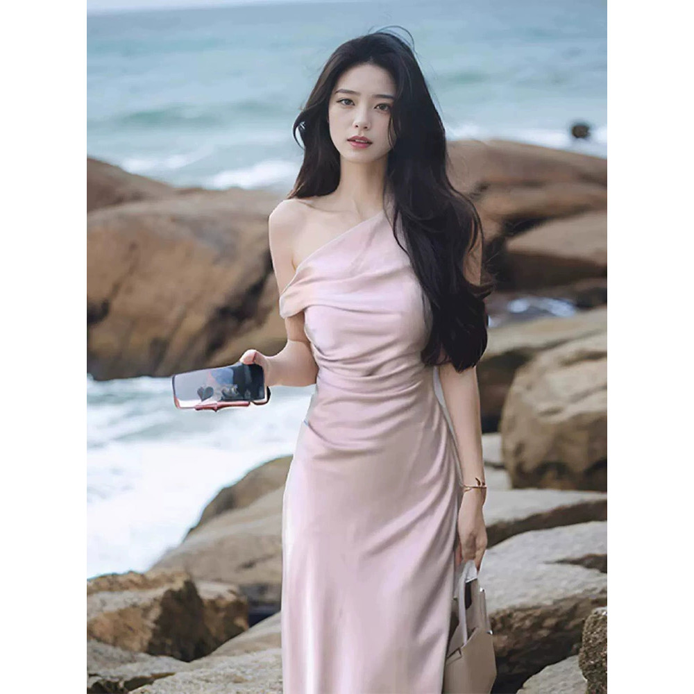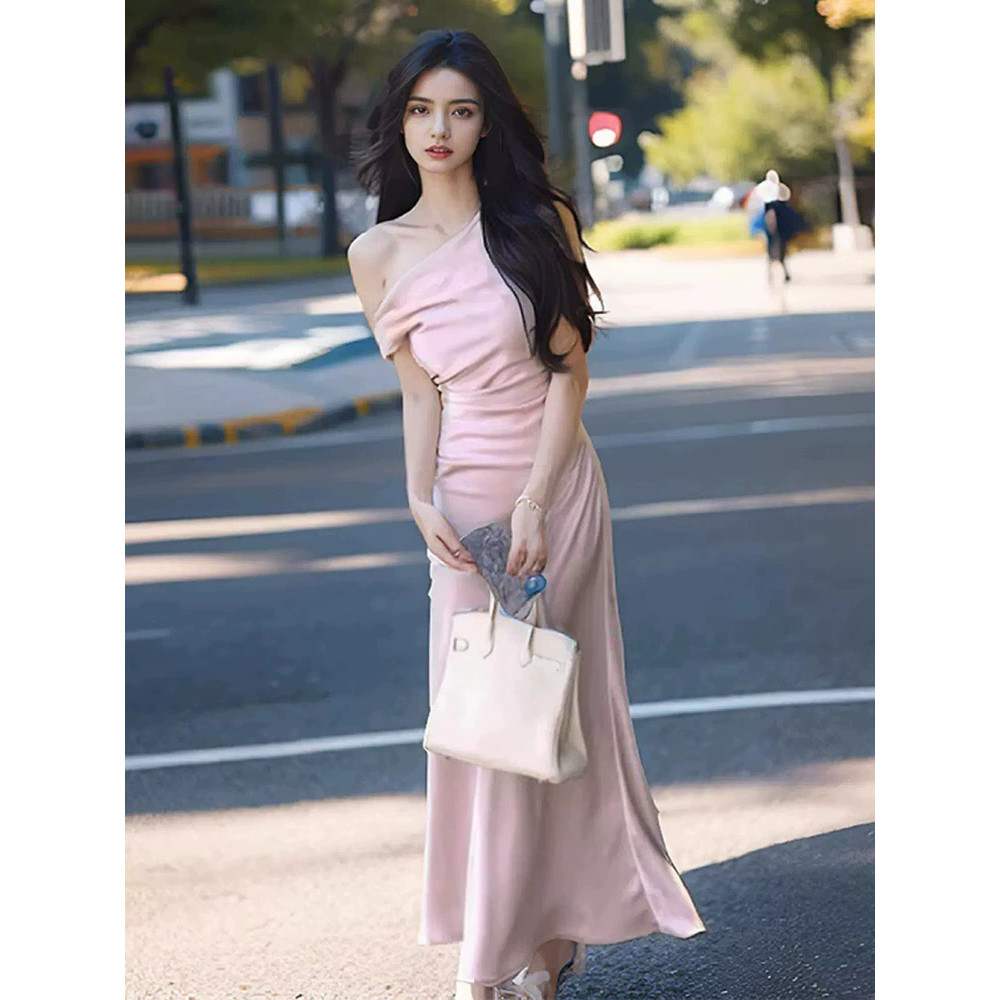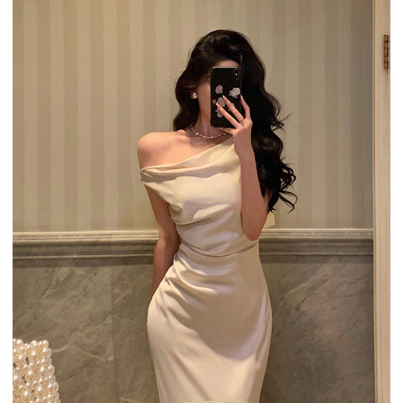Gaun satin tanpa tali temperamen Prancis / gaun malam ekor ikan rasa kelas atas gaun panjang