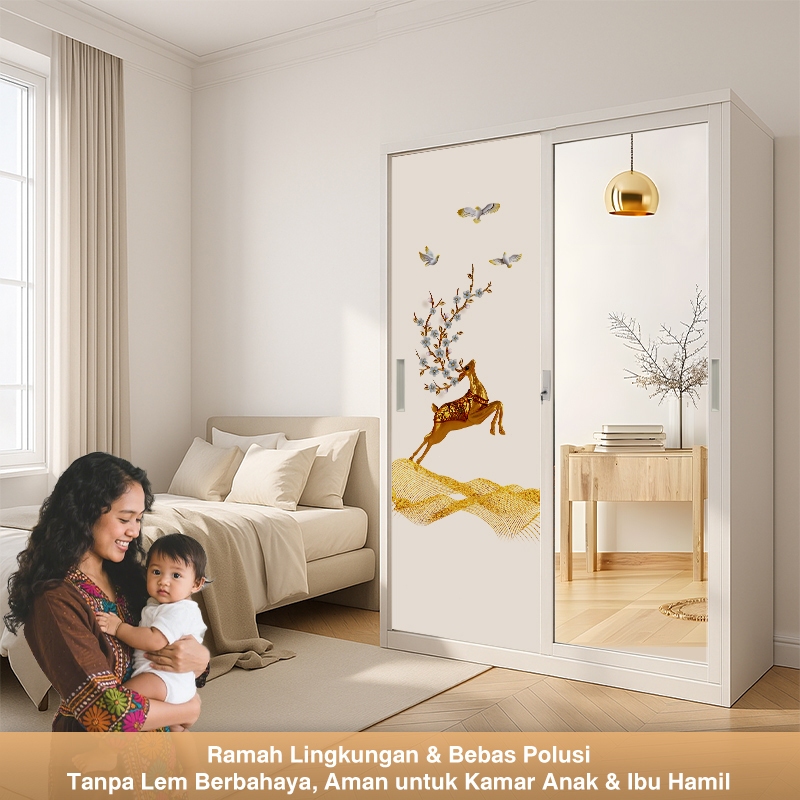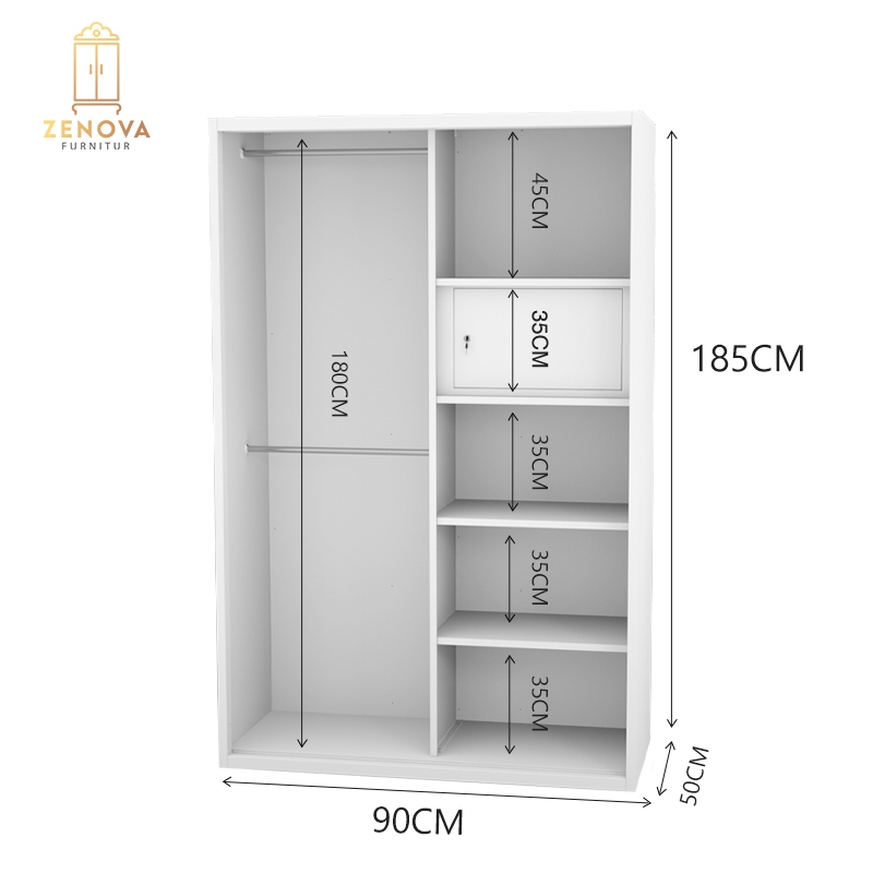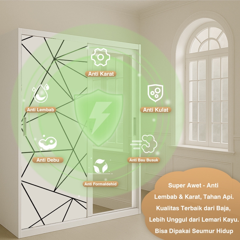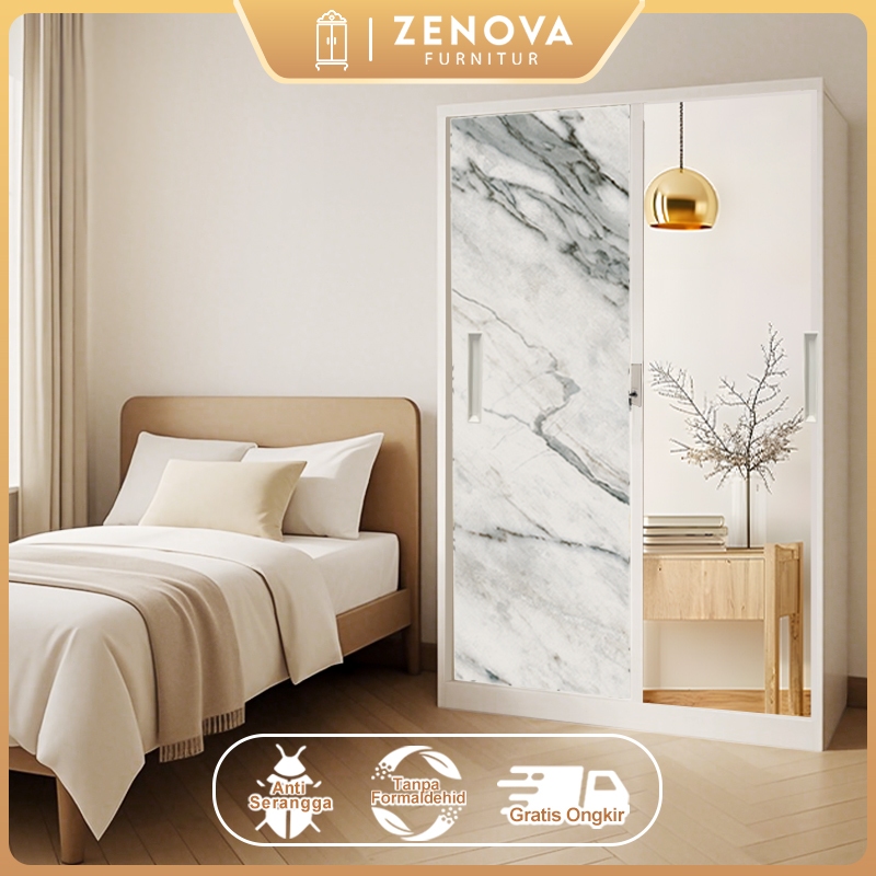 ZENOVA Official Lemari Pakaian Besi Lemari Pakaian 90cm 2 pintu slidding 2 Hanger Cermin Minimalis