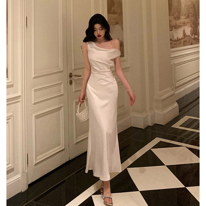 Gaun satin tanpa tali temperamen Prancis / gaun malam ekor ikan rasa kelas atas gaun panjang