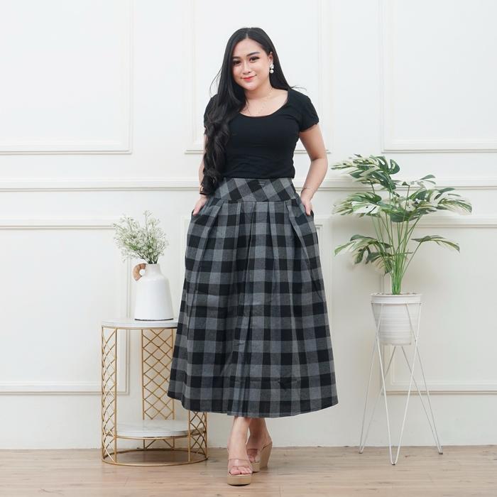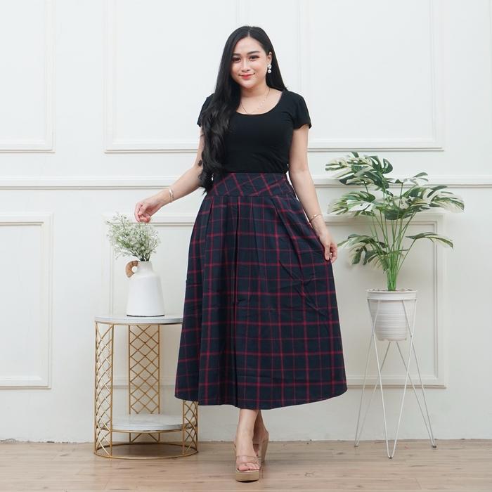 Rok Saja Midi 7/9 Flanel Kotak - Wanita Dewasa Casual Rempel - Navy Biru, All Size