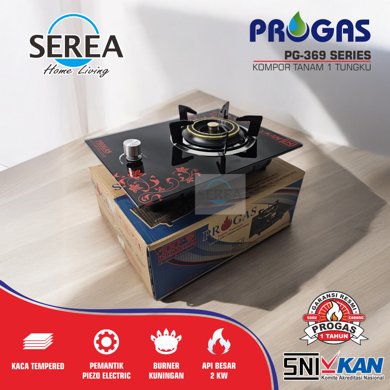 [Star] PROGAS Kompor Gas 1 Tungku Tanam PG-369 Kaca SNI Garansi 1 Tahun Api Biru Besar - Motif Bunga Merah
