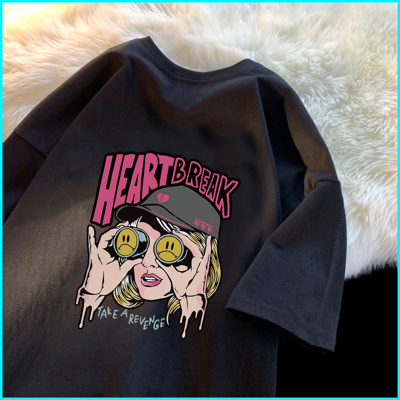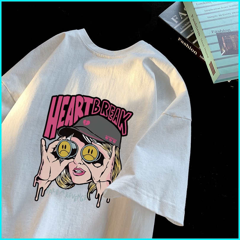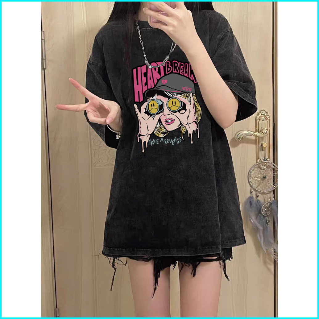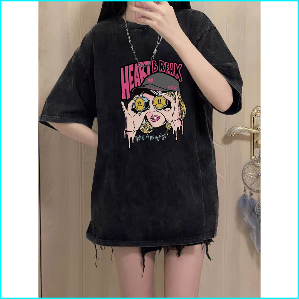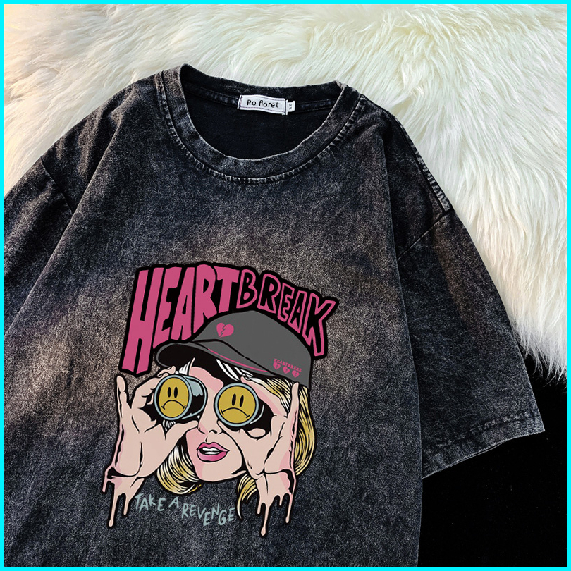 Po Floret Washed T Shirt Oversize Lengan Pendek Kaos Heart Break Katun Murni Wanita Top Premium