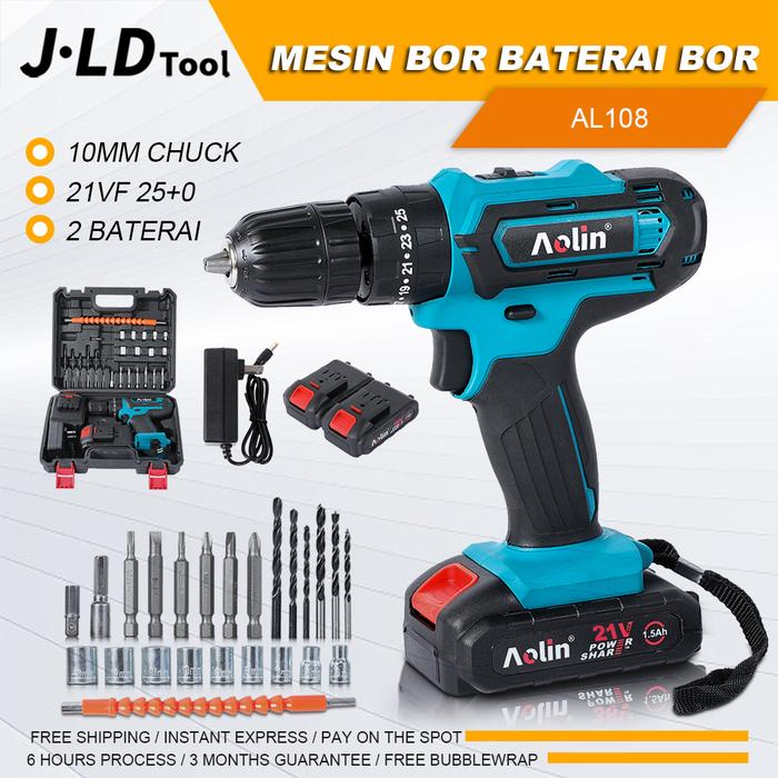 AOLIN Mesin Bor Portable 10MM 25+1 2Baterai Fullset Murah Bor Cas 21V Cordless Screwdriver 35NM borelektrik baterai full