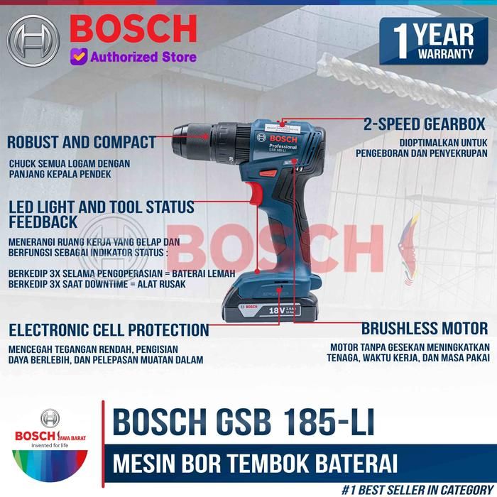 Bosch Bor Tembok Baterai Cordless GSB 185 LI 18V + Mata Bor CYL-2 5Pcs