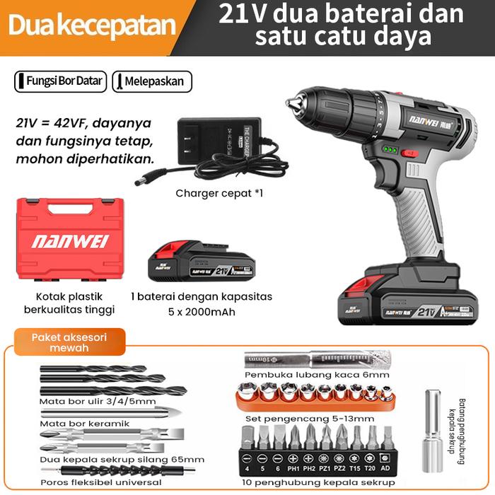Mesin Bor Cordless/Bor Baterai/ Bor Listrik/Beton Besi Kayu Full 21VF Set Pilihan Bor Tanpa Kabel - kecepatan ganda 21V,