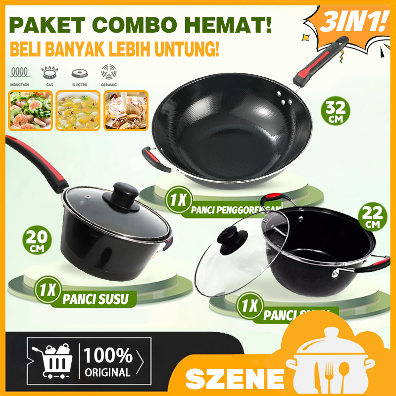 Panci Enamel Set 3 Anti Lengket Multia panci penggorengan 32cm panci susu 20CM panci sup 22CM
