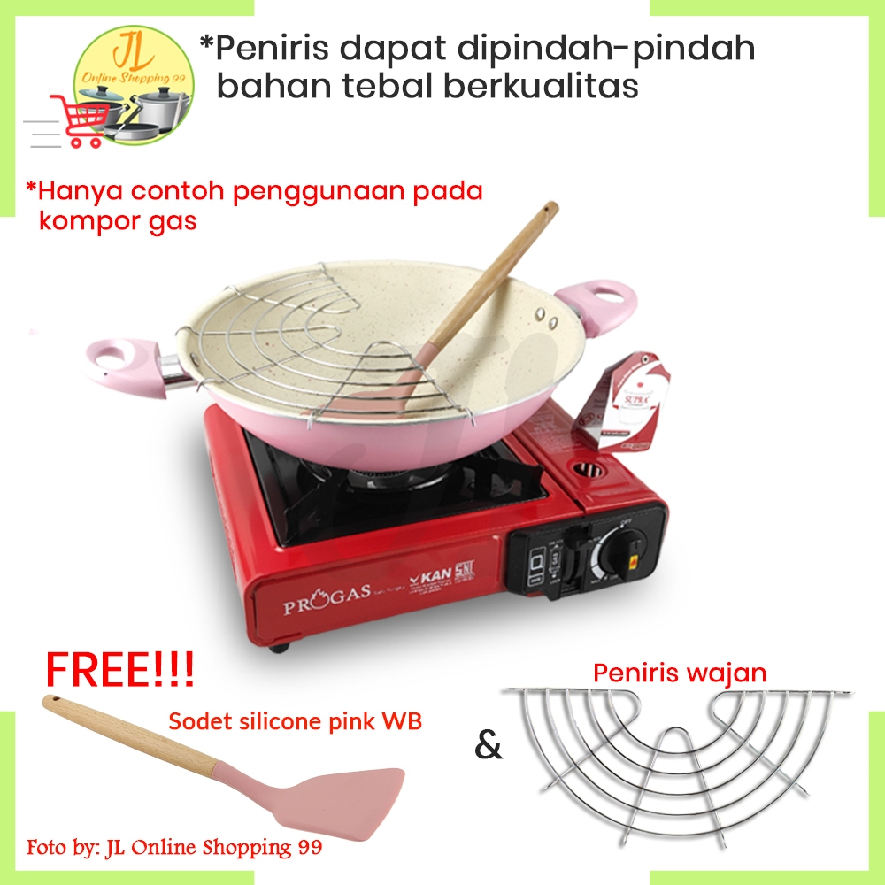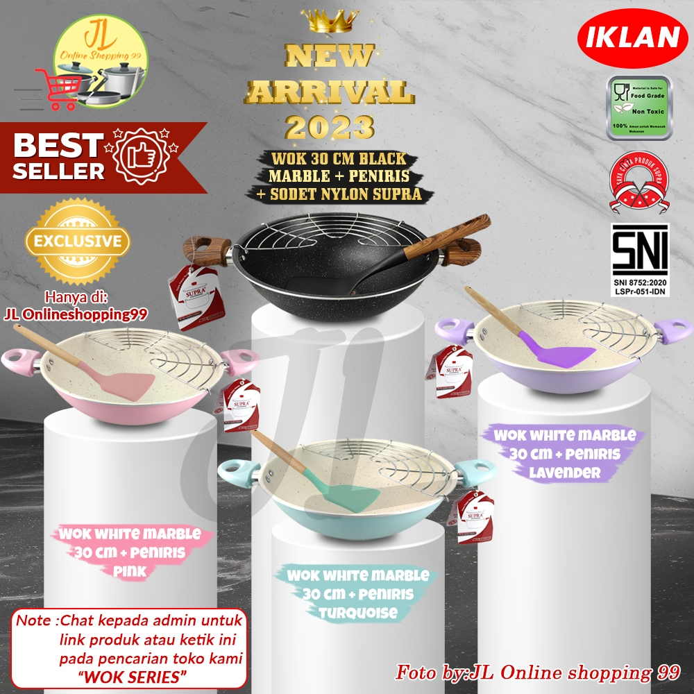 Wok set 30cm white marble pastel Pink series + peniris SUPRA / wajan penggoreng anti lengket