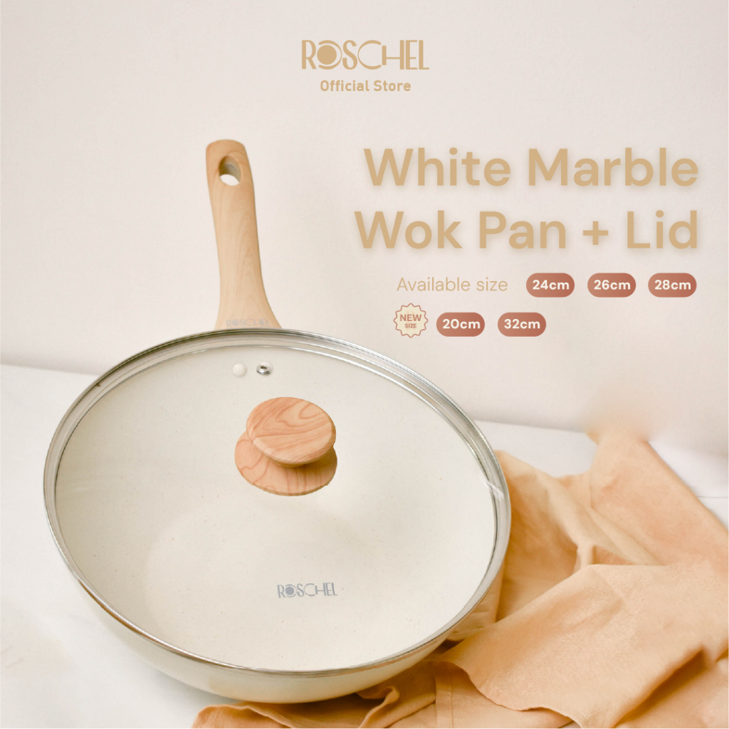 Roschel Beneta White Marble Coating Non-Stick Wok Pan 20, 24 , 26 , 28, 32 cm + Tutup Kaca Panci Wajan Penggorengan Anti