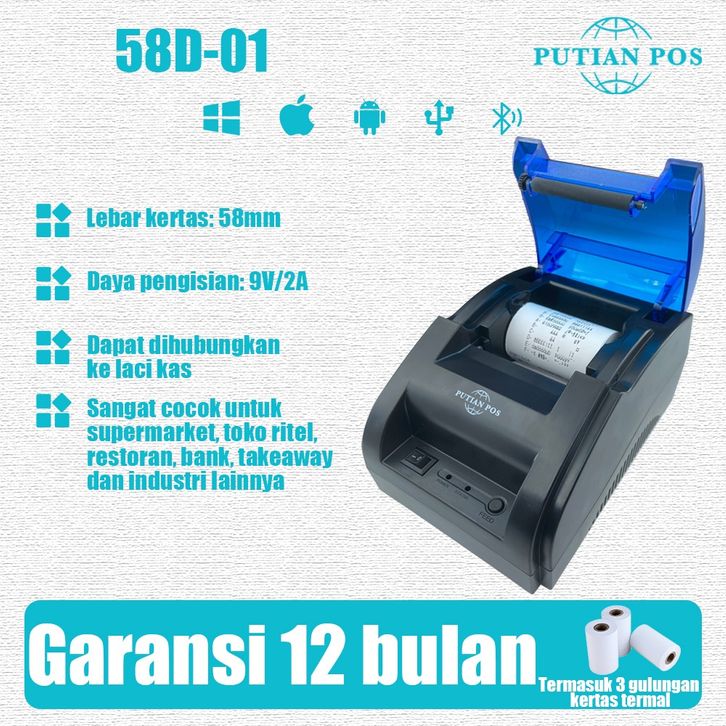 PUTIAN POS Printer Bluetooth Termal 58D-01 Kasir Printer Mini Portabel/Dukungan PPOB (Bluetooth+USB)