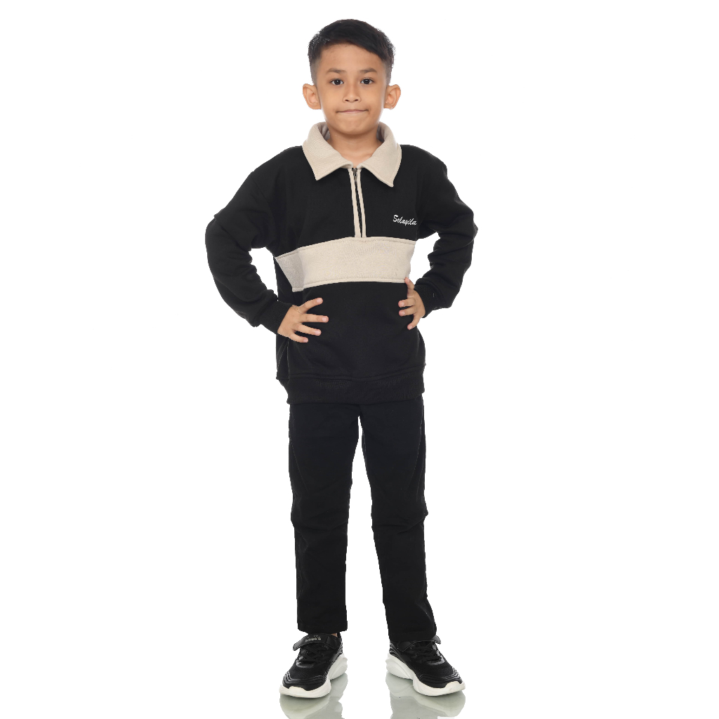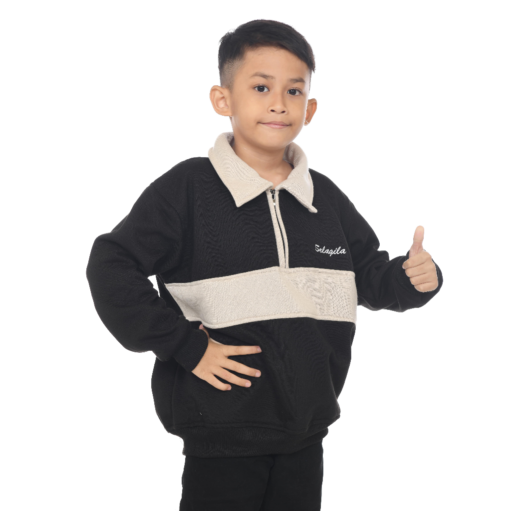 SELAGILA JAKET RUGBY ANAK BORDIR HALFZIP HITAM BAHAN FLEECE TEBAL