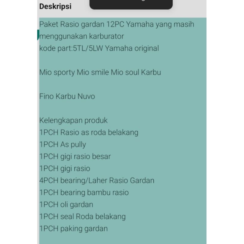 PAKET GIGI RASIO GEAR BOX GARDAN 5TL/5LW 12PCH YAMAHA MIO SPORTY MIO SMILE MIO SOUL KARBU FINO KARBU NUVO