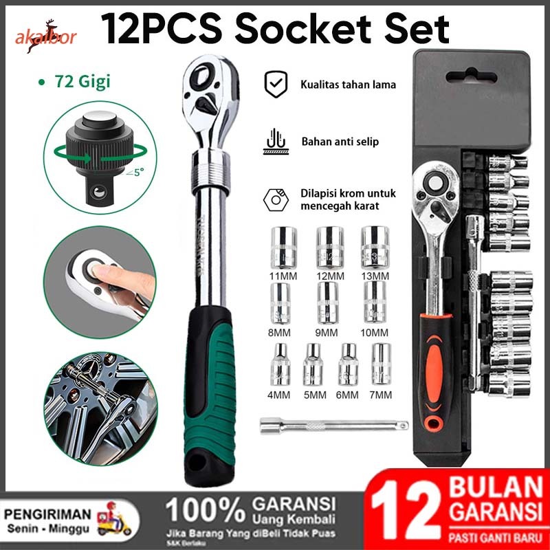 ✨Hot✨ akaibor Kunci Socket Sok Set 12pcs 1/2Inch Socket Wrench Kunci Pas Multifungsi Kunci Gagang Rachet