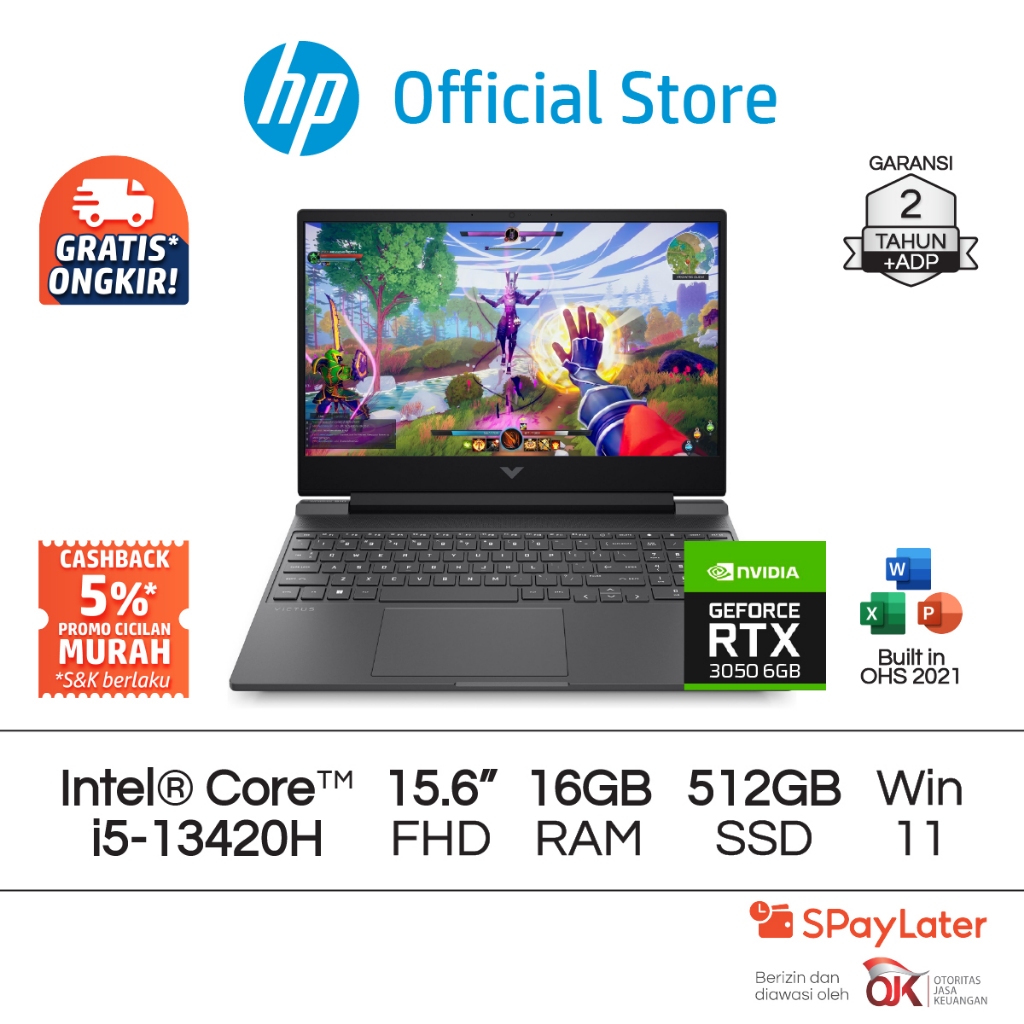 Victus Laptop Gaming HP Intel Core i5 NVIDIA GeForce RTX 3050 16GB RAM 512GB SSD Silver Free Windows 11 Home 15.6 Inch 144 Hz Garansi 2 Tahun Promo Murah Gratis Ongkir Official Non Second