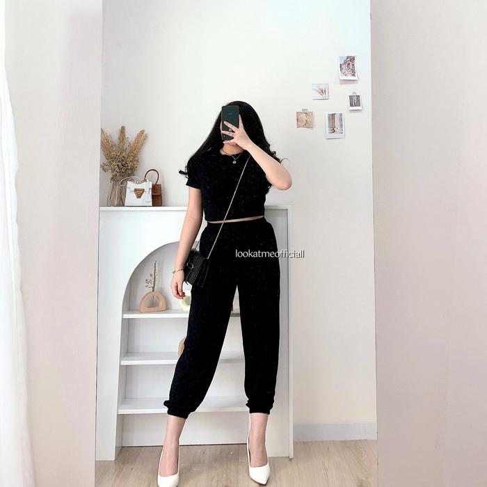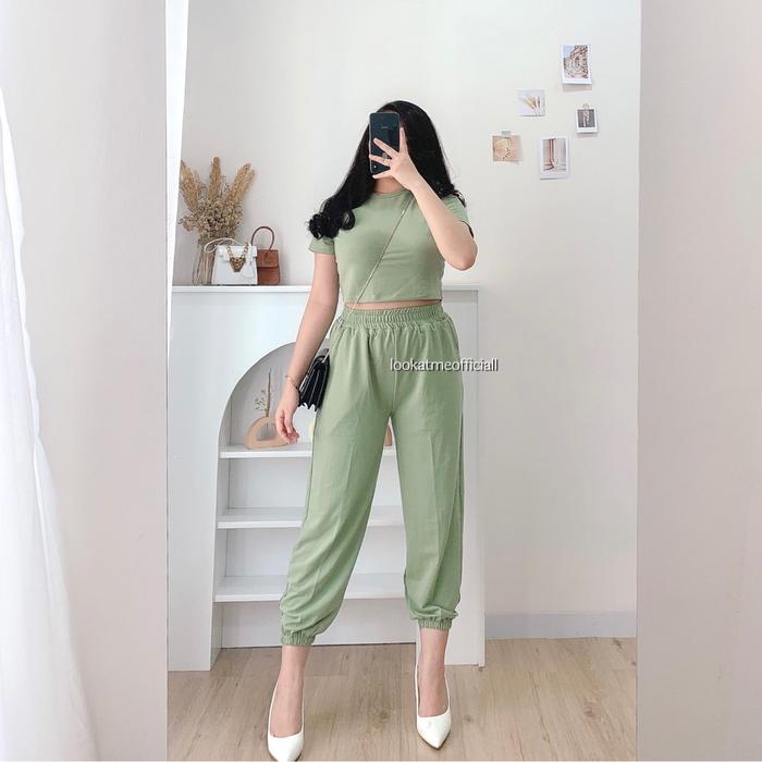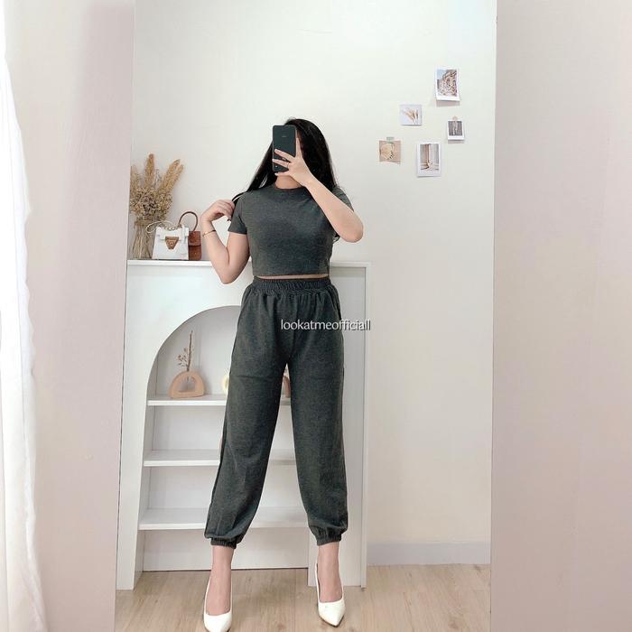 Lookatmeofficial • Zoey Set - Setelan Wanita Premium Celana Jogger Crop Top Atasan Baju Karet Pendek Panjang Dewasa -
