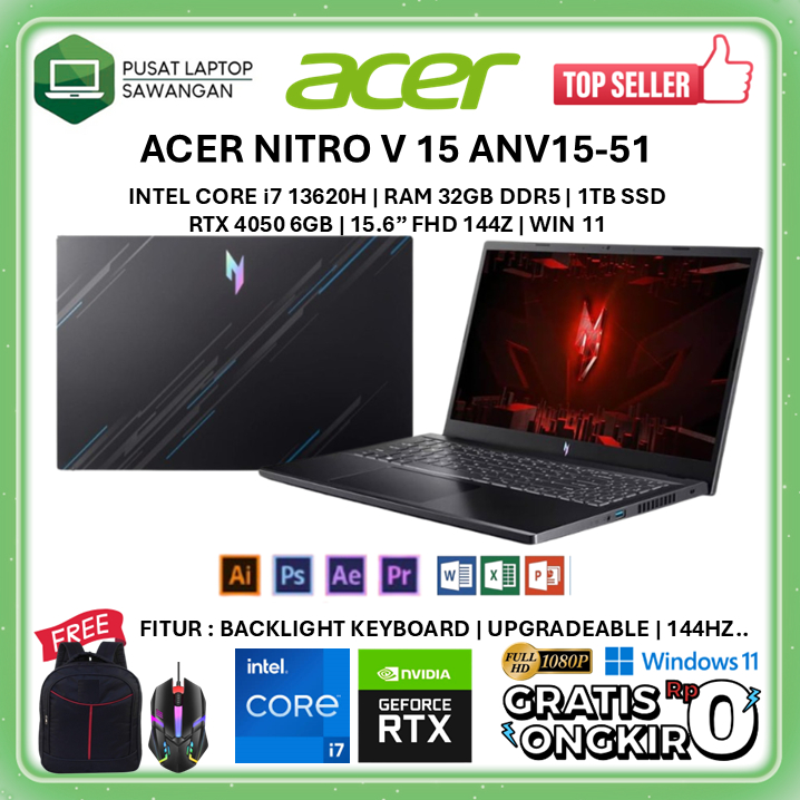 LAPTOP GAMING ACER NITRO V 15 RTX 4050 INTEL CORE i7 13620H RAM 32GB 1TB SSD 15.6 INCH FHD IPS 144HZ