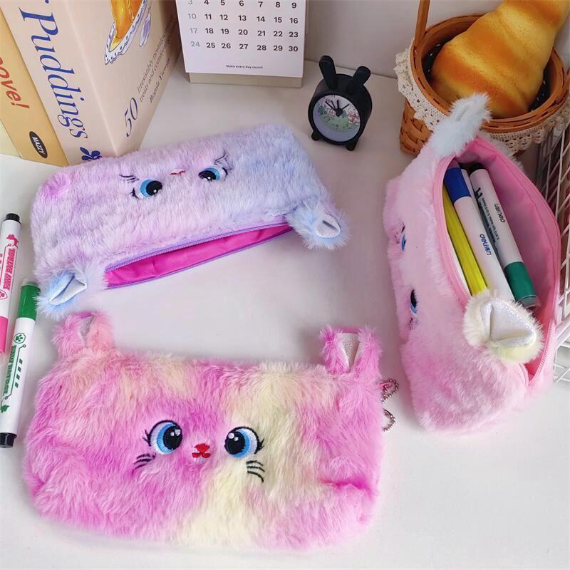 KOTAK PENSIL BULU HALUS WARNA RAINBOW WAJAH KUCING TEMPAT PENSIL ALAT-ALAT SEKOLAH LUCU - wadah pensil
