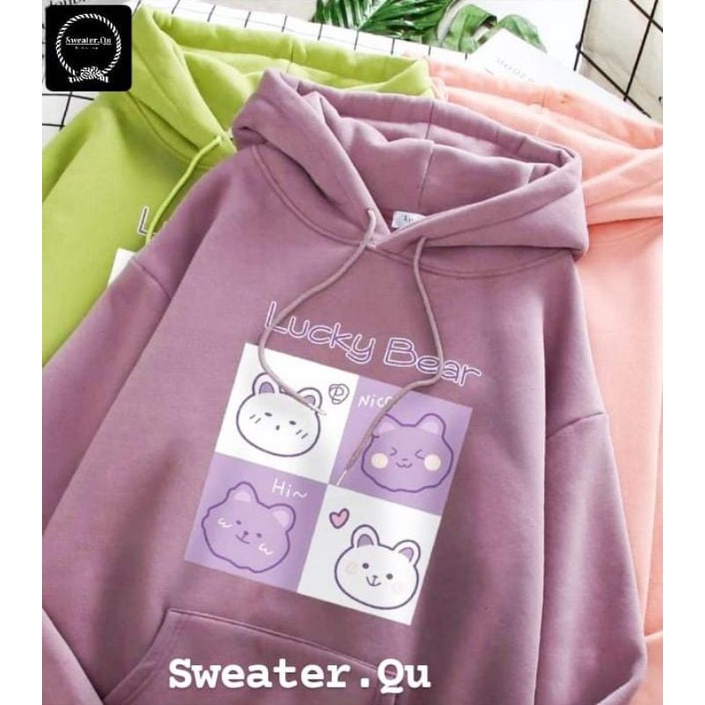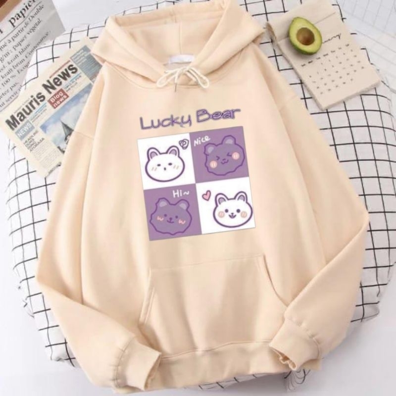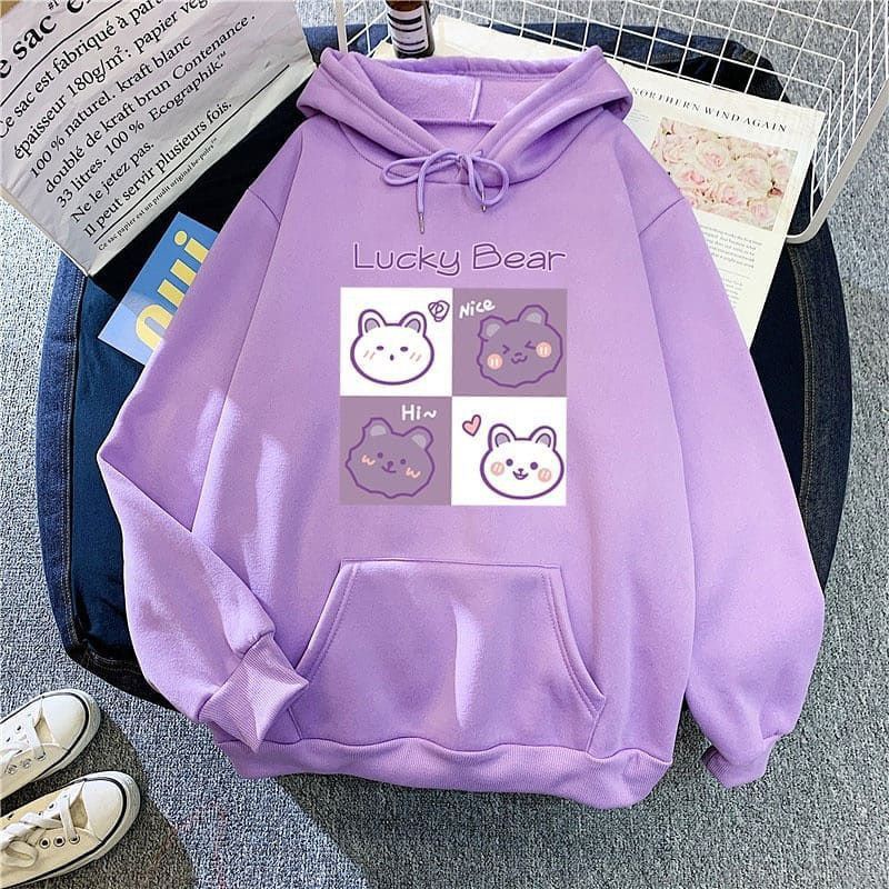JUMPER HOODIE ANAK CEWEK LUCKY BEAR KITTY LILAC | SWEATER BAHAN FLEECE TEBAL UNTUK USIA 5 - 16 TAHUN