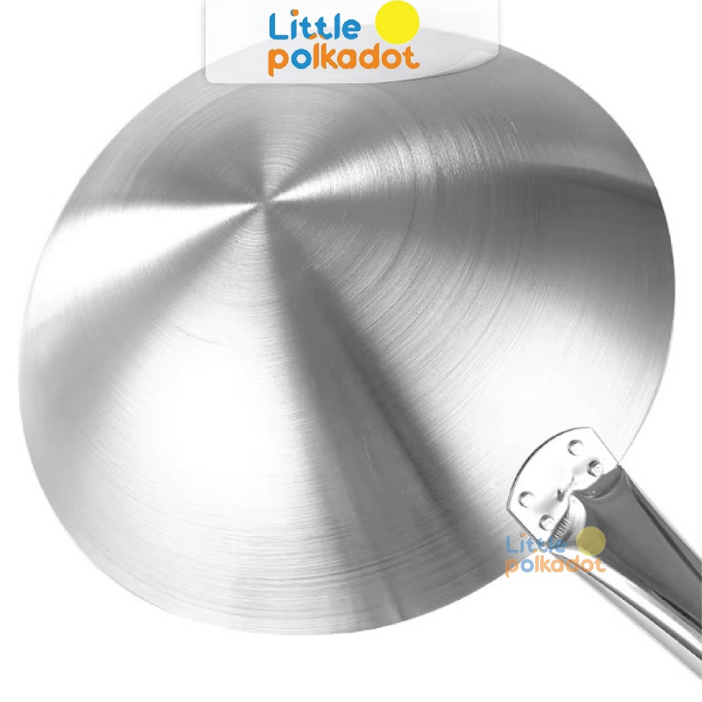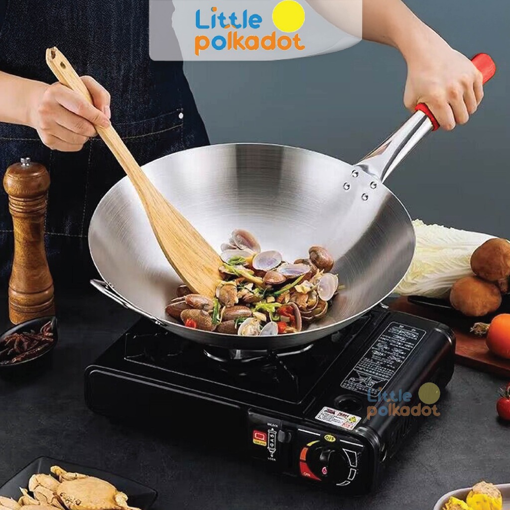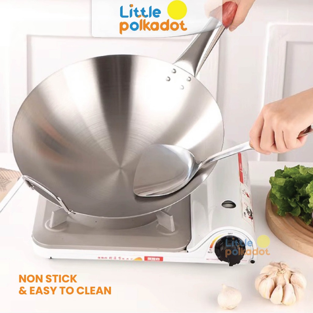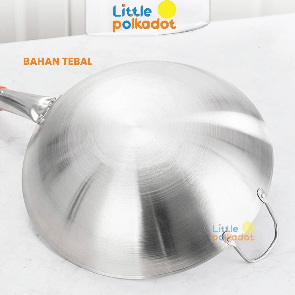 【Littlepolkadot】34CM 36CM Kuali Anti Lengket PREMIUM Gagang KAYU Stainlss Steel Panjang Wajan Stainless sus 304 Wok anti