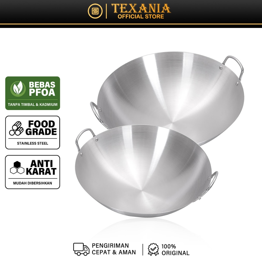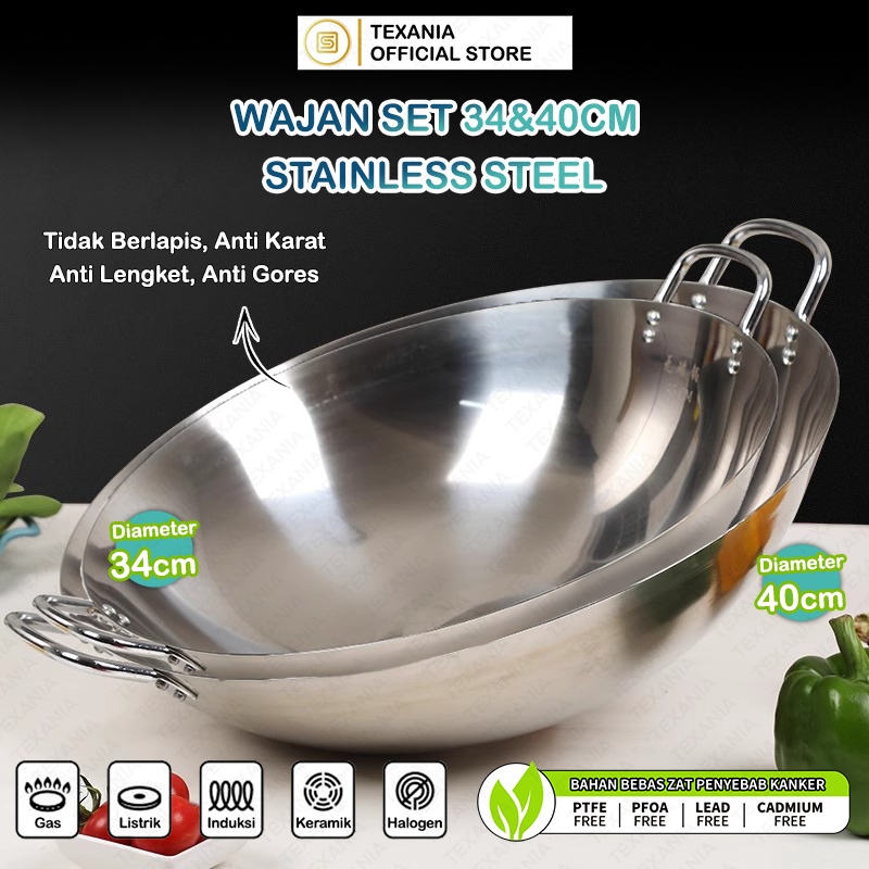 TEXANIA Wajan Stainless Wajan Set 34&40cm Premium dengan Pegangan Kuali Besar Katel Anti Lengket