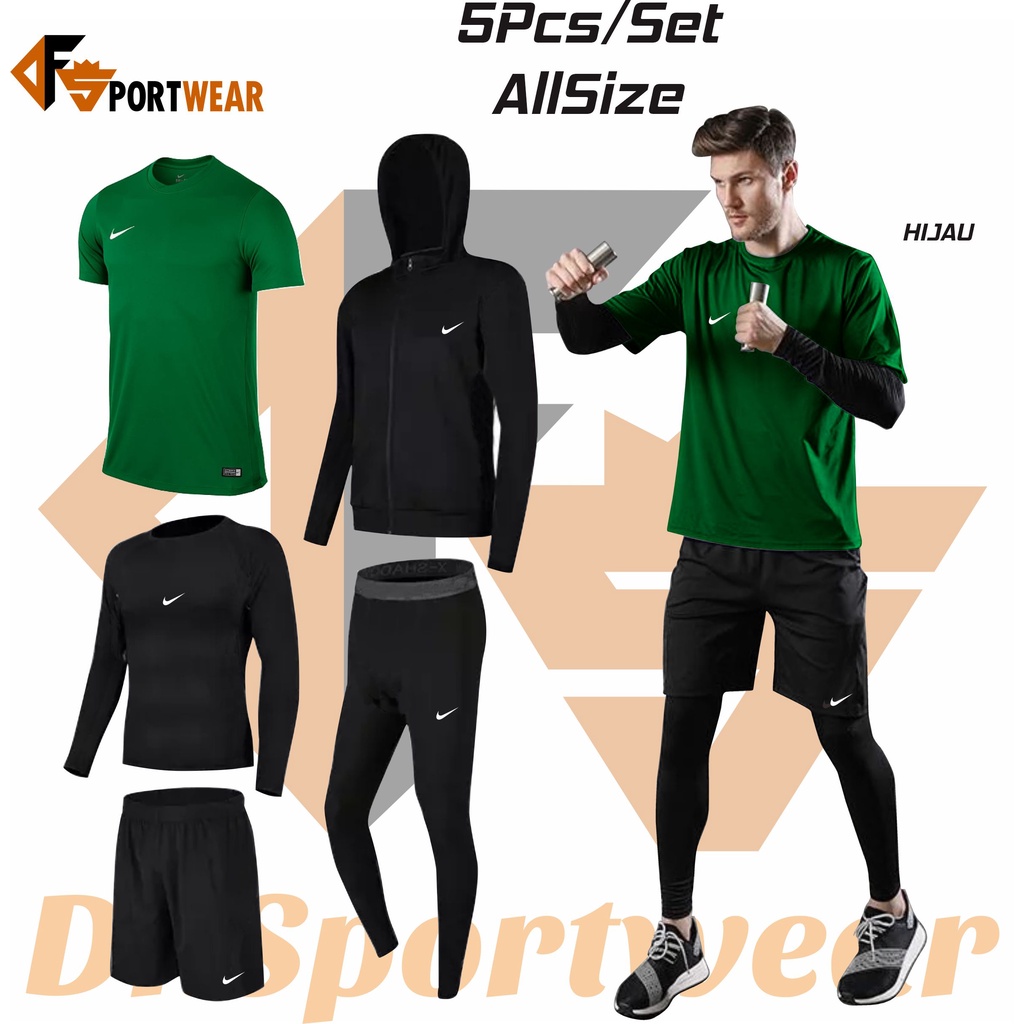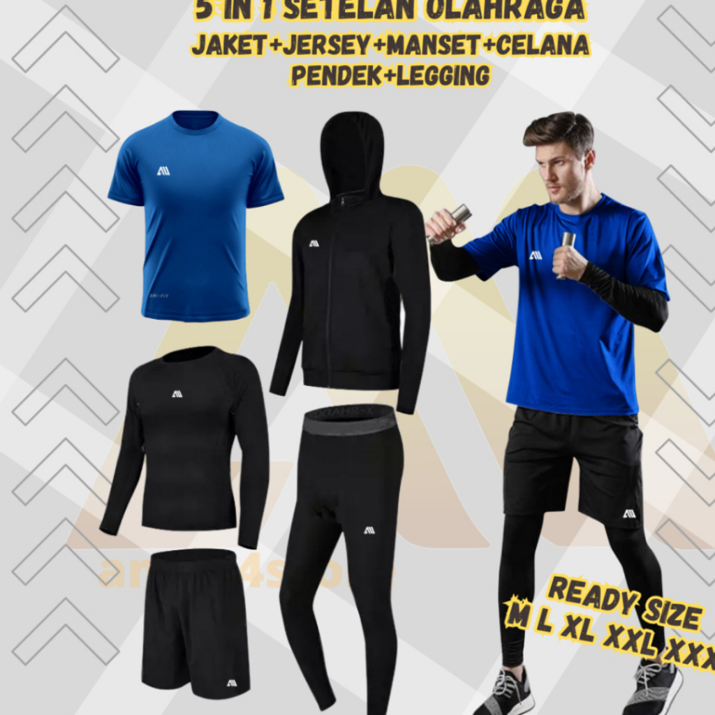 Stelan Olahraga Pria 5in1 Jaket Hodie Kaos Manset Jersey Celana Dryfit Manset Legging