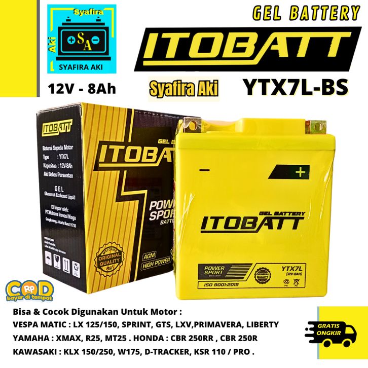 Aki Motor VESPA LX150, PRIMAVERA, SPRINT, X MAX, R25, MT25, CBR 250,KLX 250 ITOBATT YTX7L-BS GEL 8Ah