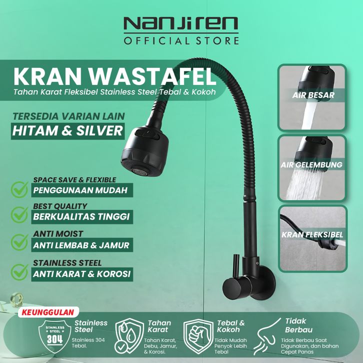 Kran Air Hitam Sink Wastafel Keran Angsa Tembok Dapur Cuci Piring Stainless Steel Fleksibel