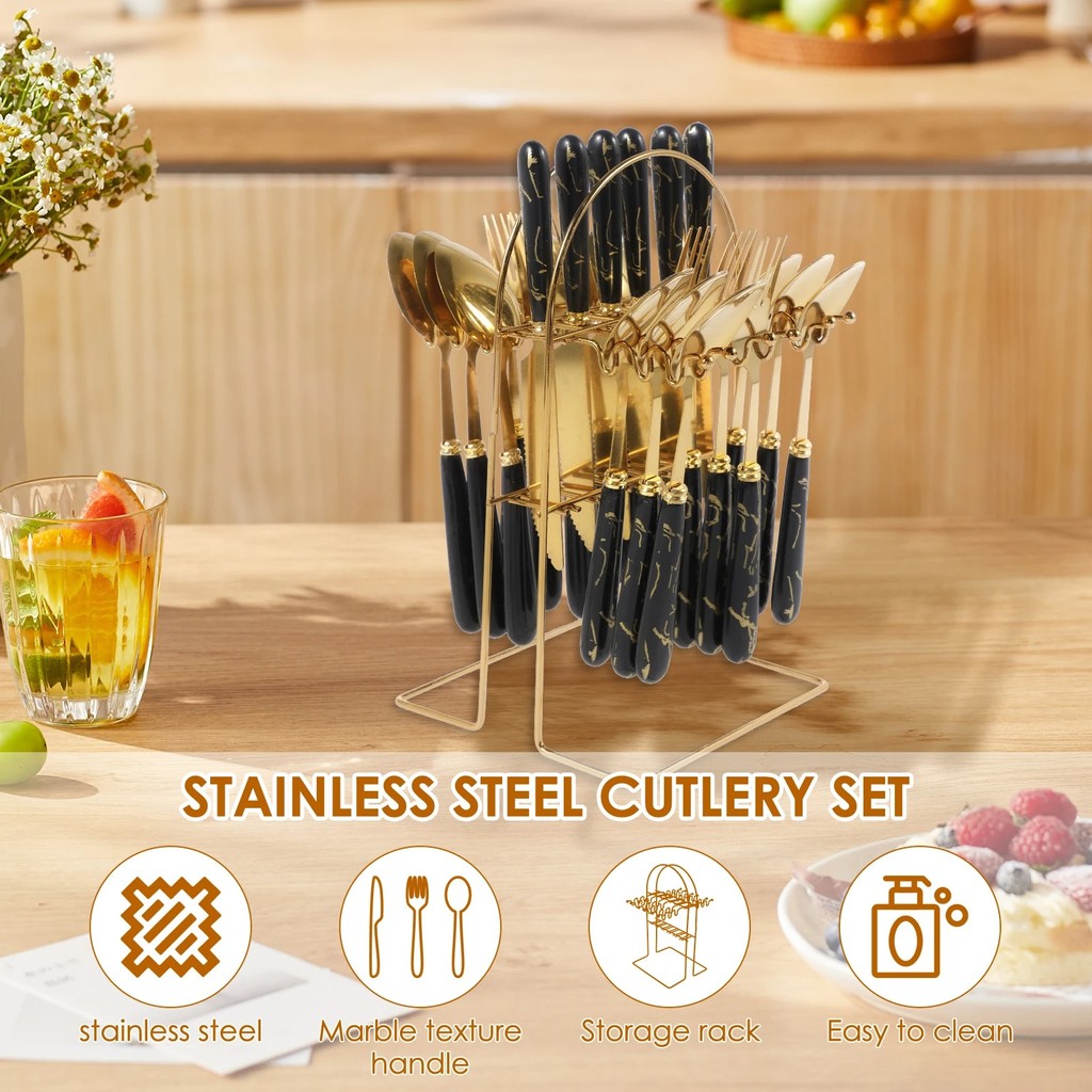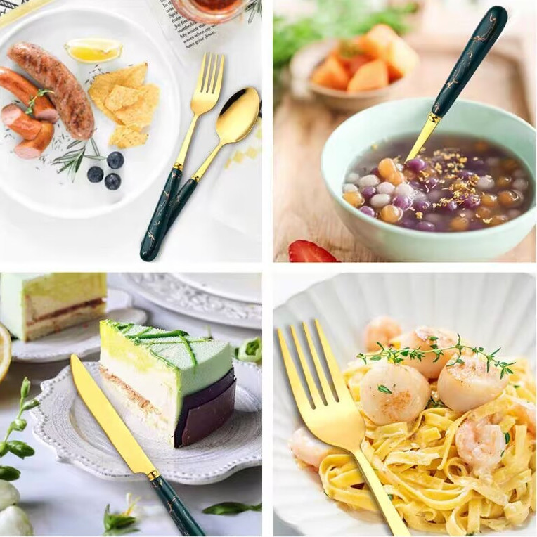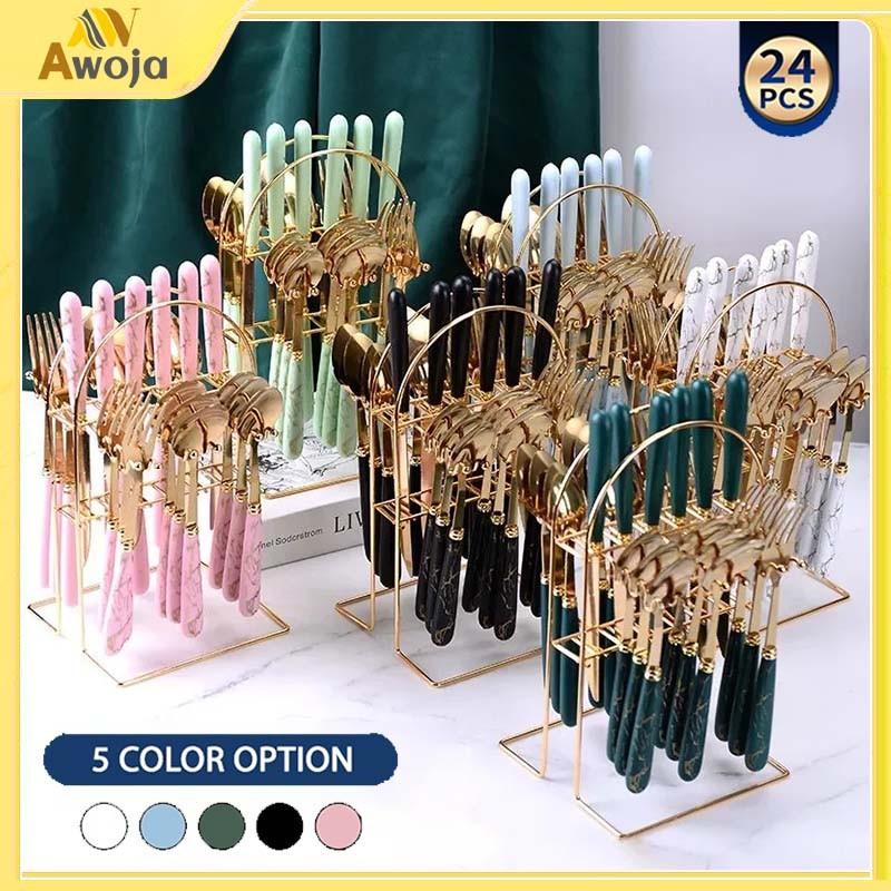 24Pcs Sendok Cutlery Set Gold Marble Sendok Garpu Makan Set Peralatan Makan Stainless Steel Sendok Garpu dan Pisau Set c