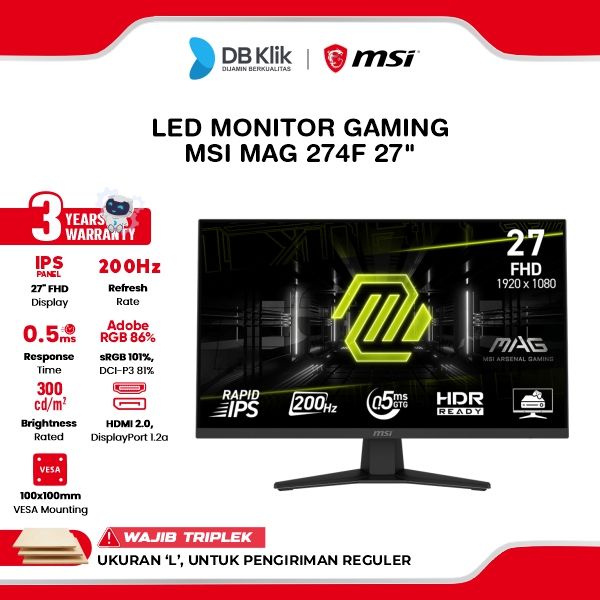 MSI LED MONITOR GAMING MAG 274F 27" IPS FHD 200HZ 0.5MS AMD FREESYNC PREMIUM HDR HDMI DP
