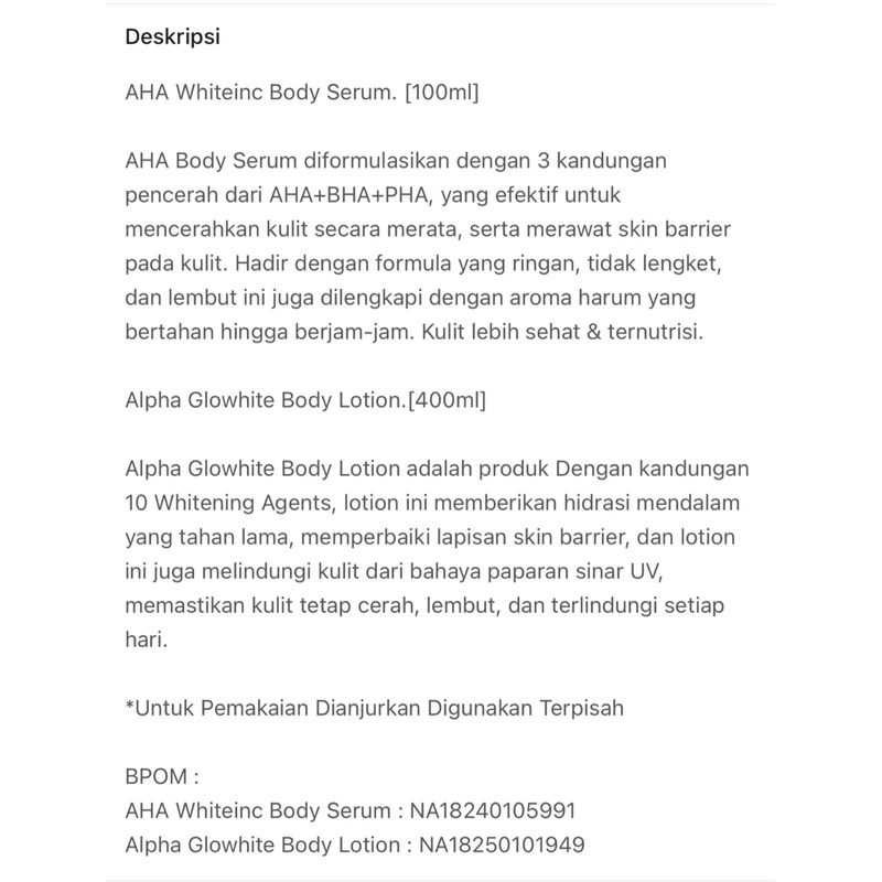 Bundling Paket Glow Boost Complex White Inc Aha Body Serum + Alpha Glowhite Body Lotion / Paket Pencerah Tubuh / Whiteni