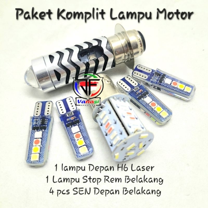 Paket HEMAT Komplit Combo Lampu Motor H6 Laser Putih Kuning Lampu Rem 30 Mata Bayonet LED + Sen 4 Pcs Depan Belakang Universal Dc 12 Volt Motocycle