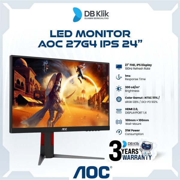 AOC LED MONITOR GAMING 27G4 27" IPS FHD 180HZ 1MS ADAPTIVE SYNC HDR10 FULL ERGONOMIC STAND HDMI DP
