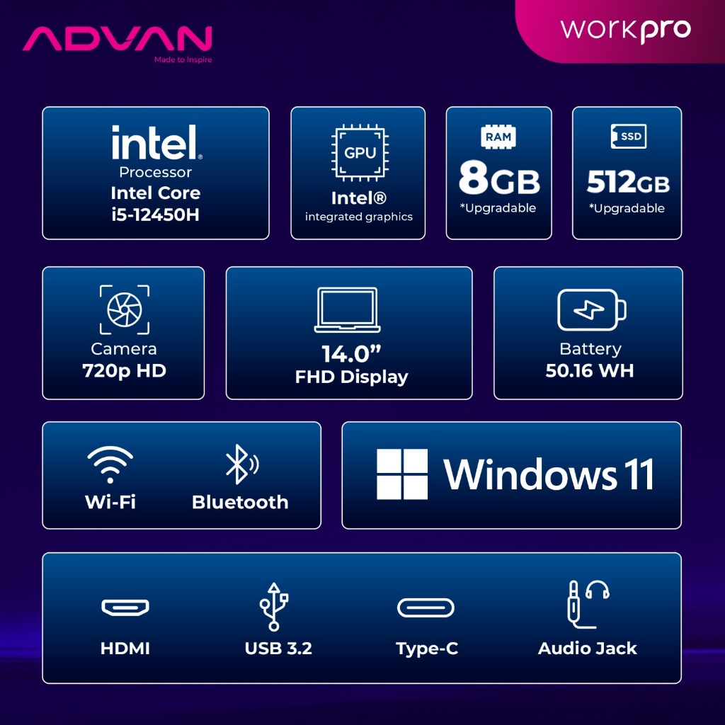 Advan Notebook Laptop Workpro Intel I5 12450H 14'' Fhd Ips 8Gb 512Gb Win 11