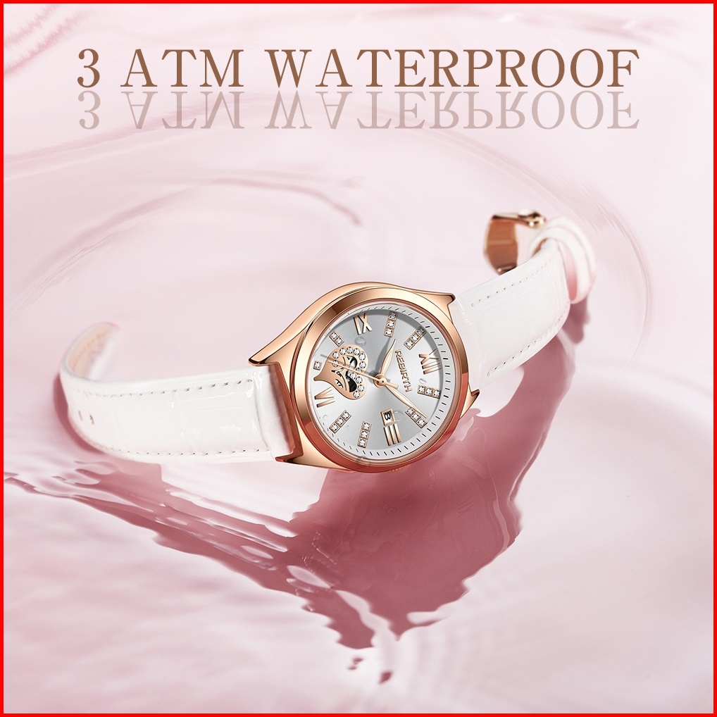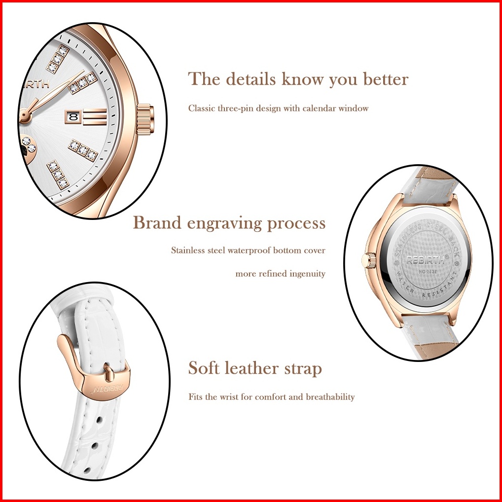 Rebirth Jam Tangan Wanita Anti Air Kuarsa Calendar Tali Kulit Mewah Berlian Jam Tangan Cewek
