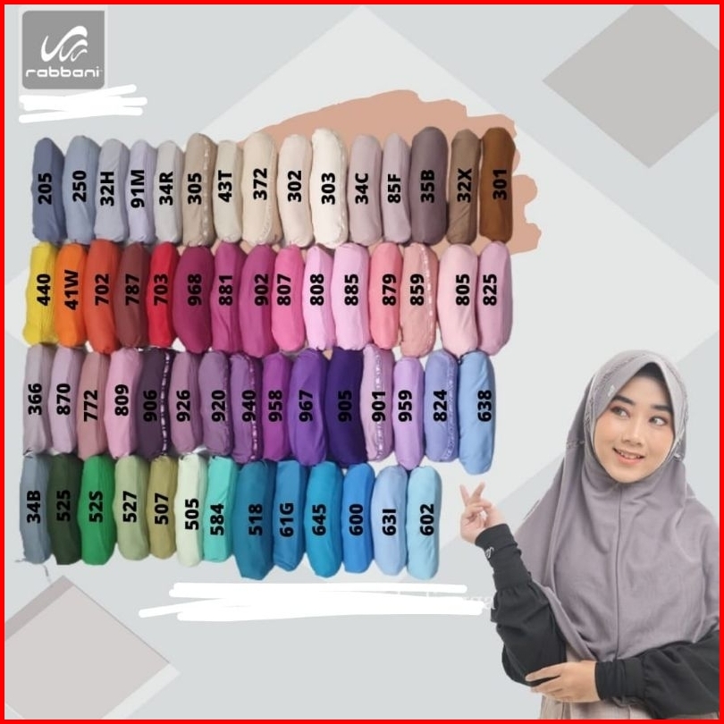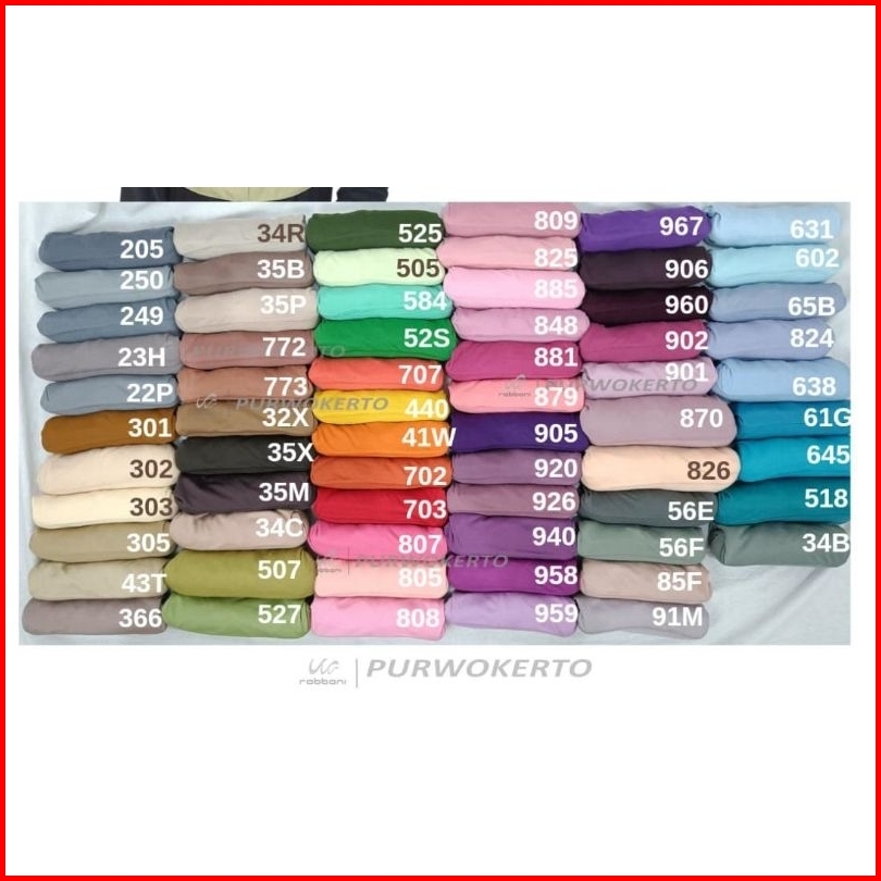 Putih 100, Hitam 200, Abu 201, Maroon 701, Coklat 300, Biru dongker 604, Army 525, Rose808, Rose Pink 885, Pink 807, Hijau Khaky 507, Ungu Crimson 902, Dusty pink cerah 825, Biru Toska 645, Hijau Toska 518, 958, Hijau pupus 505, Ungu Terong 905, Coklat Tanah 301, Powder blue 638, Orange Bata 702, Baby blue 602, Ungu muda 959, Pink Fanta 881, Peach 879, Abu Tua 205, Lavender Tua 940, Hijau Pemda 527, Cream 303, Biru Laut 601, Ungu Manggis 906, Abu muda 250, Nugget 440, Coksu kode 305, Hijau NU kode 52S