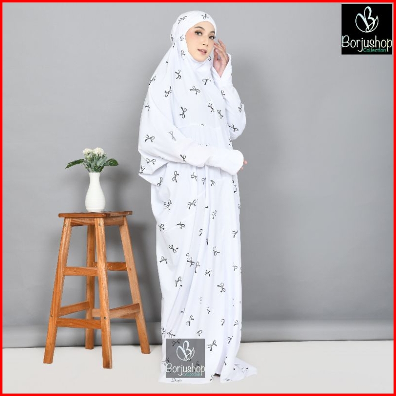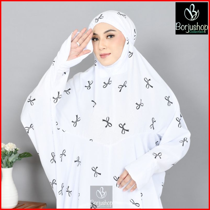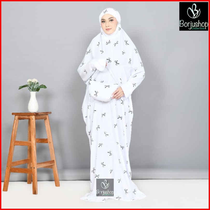 Mukena Terusan Dewasa Katun Travelling 2in1 Resleting Motif Printing Pita Coquette Ribbon