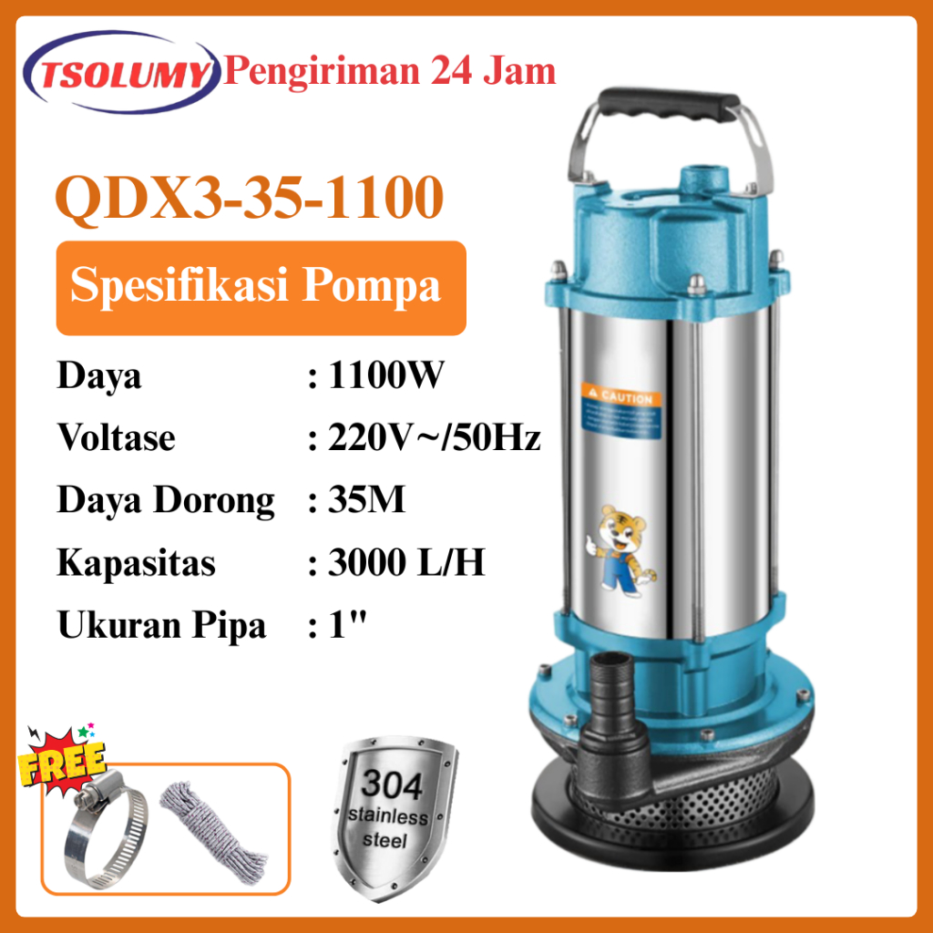 Tsolumy Pompa Celup Air Kotor 1100W Stainless Submersible Pump 1'/1.2'inch Pompa Kolam lkan / Banjir