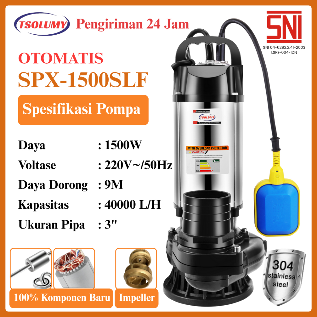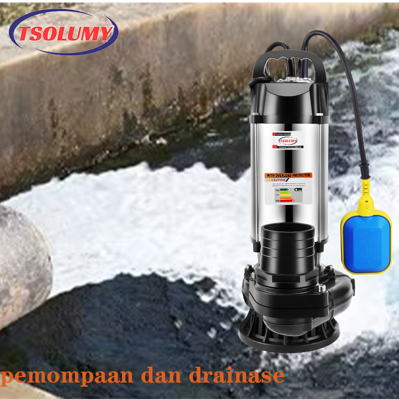 Tsolumy Pompa Celup Air Kotor Otomatis 1500W Stainless Submersible Pump 3inch Pompa Kolam dan Banjir
