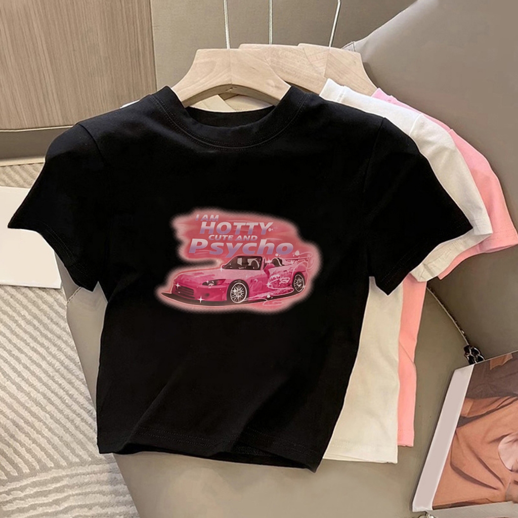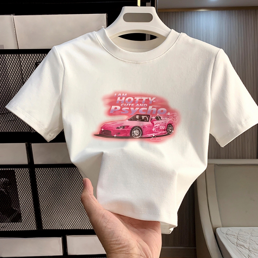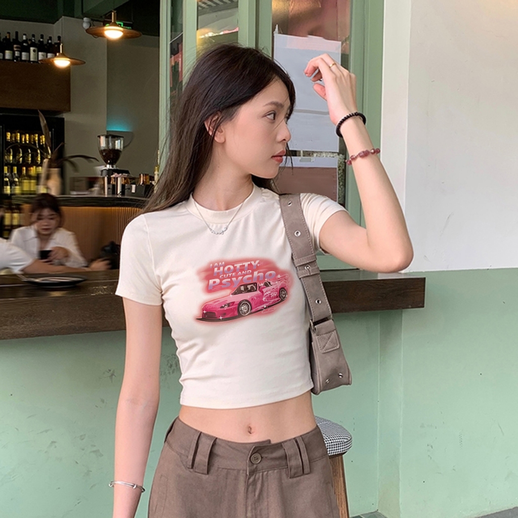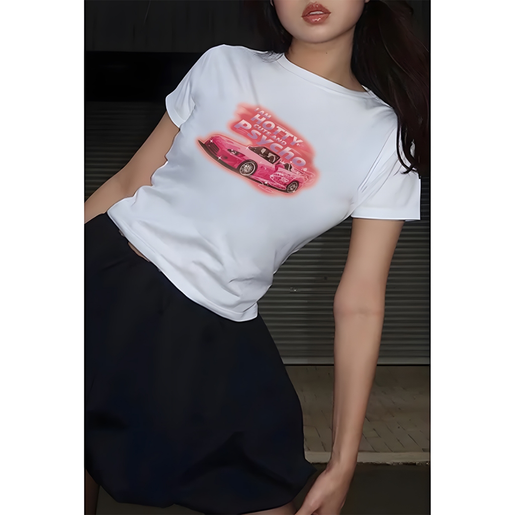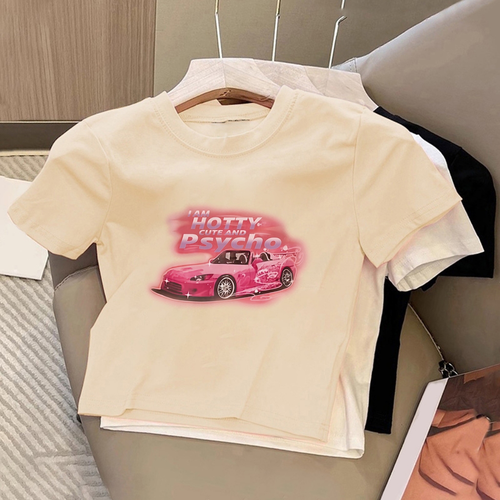 JW T-shirt Crop Top Lengan Pendek Kaos Wanita Crop Top Korea Pink sports car Print Kaos Crop Wanita Kekinian Baju Crop Top Wanita Putih Crop Top Y2k