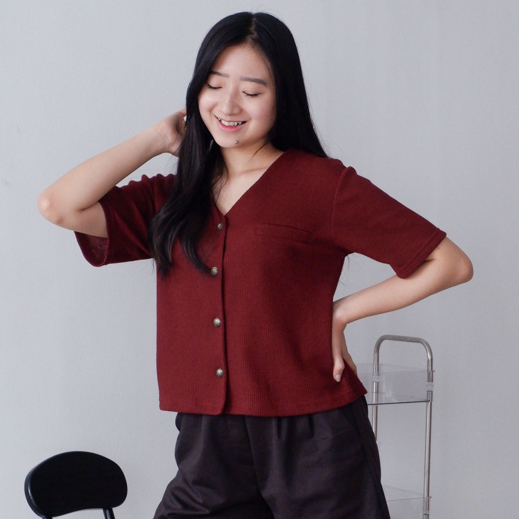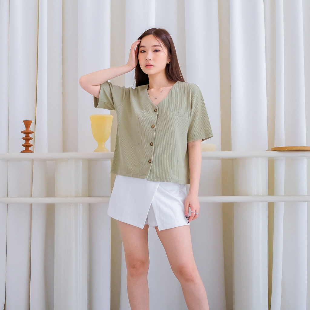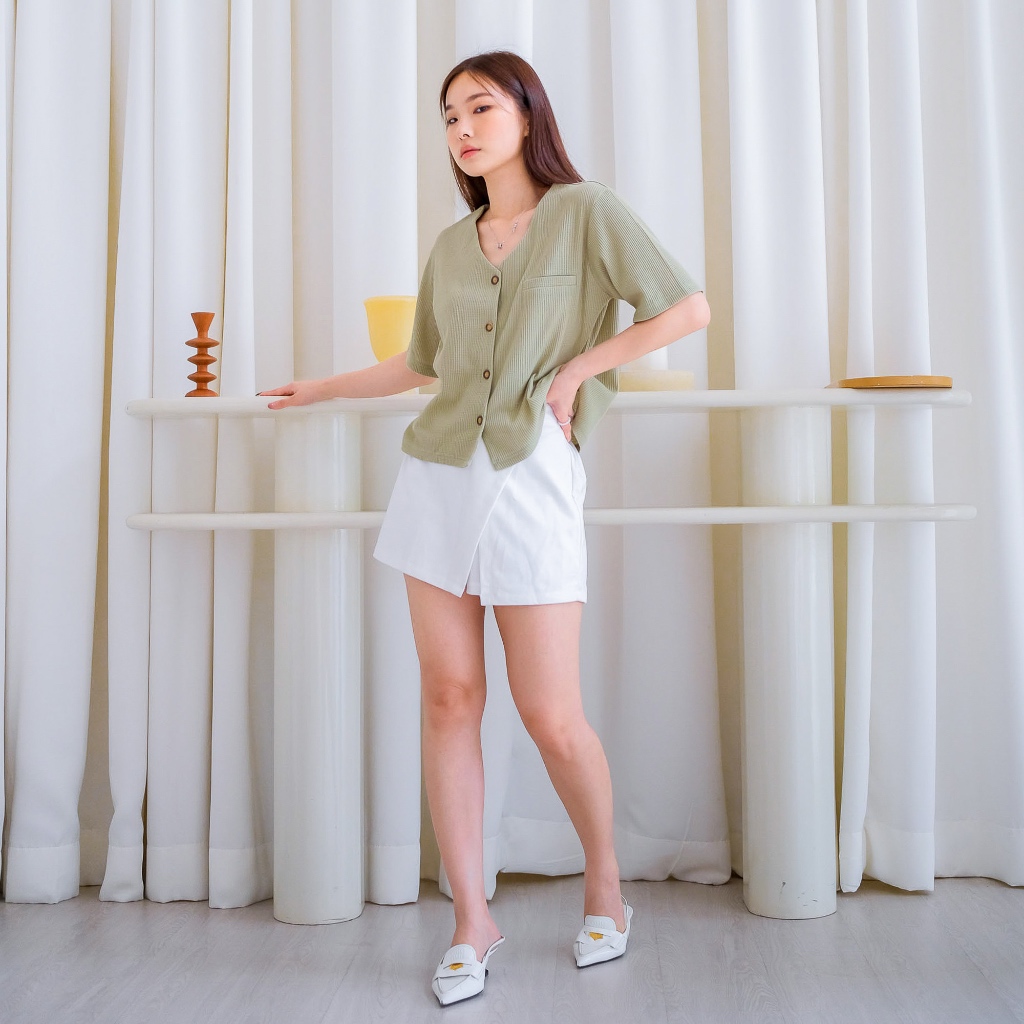 Isla Zoe Waffle Top Short Sleeve with Buttons - Atasan Wanita Lengan Pendek - Kemeja Wanita - Baju Wanita Kekinian - Kemeja Kerja - Baju 17 Agustus