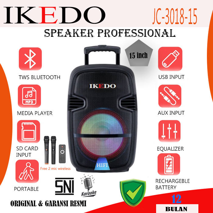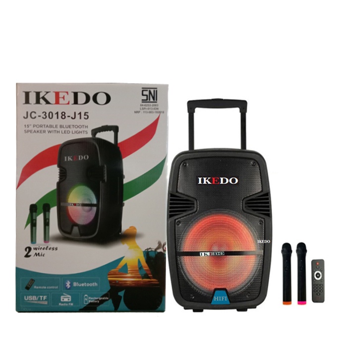 IKEDO Speaker Aktif 15 inch Speaker 2 Mic Bluetooth Portable JC-3018-15 (GRATIS PACKING KAYU)