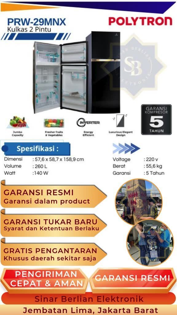 POLYTRON Kulkas 2 Pintu Kaca Belleza Jumbo PRW-29MNX Hitam