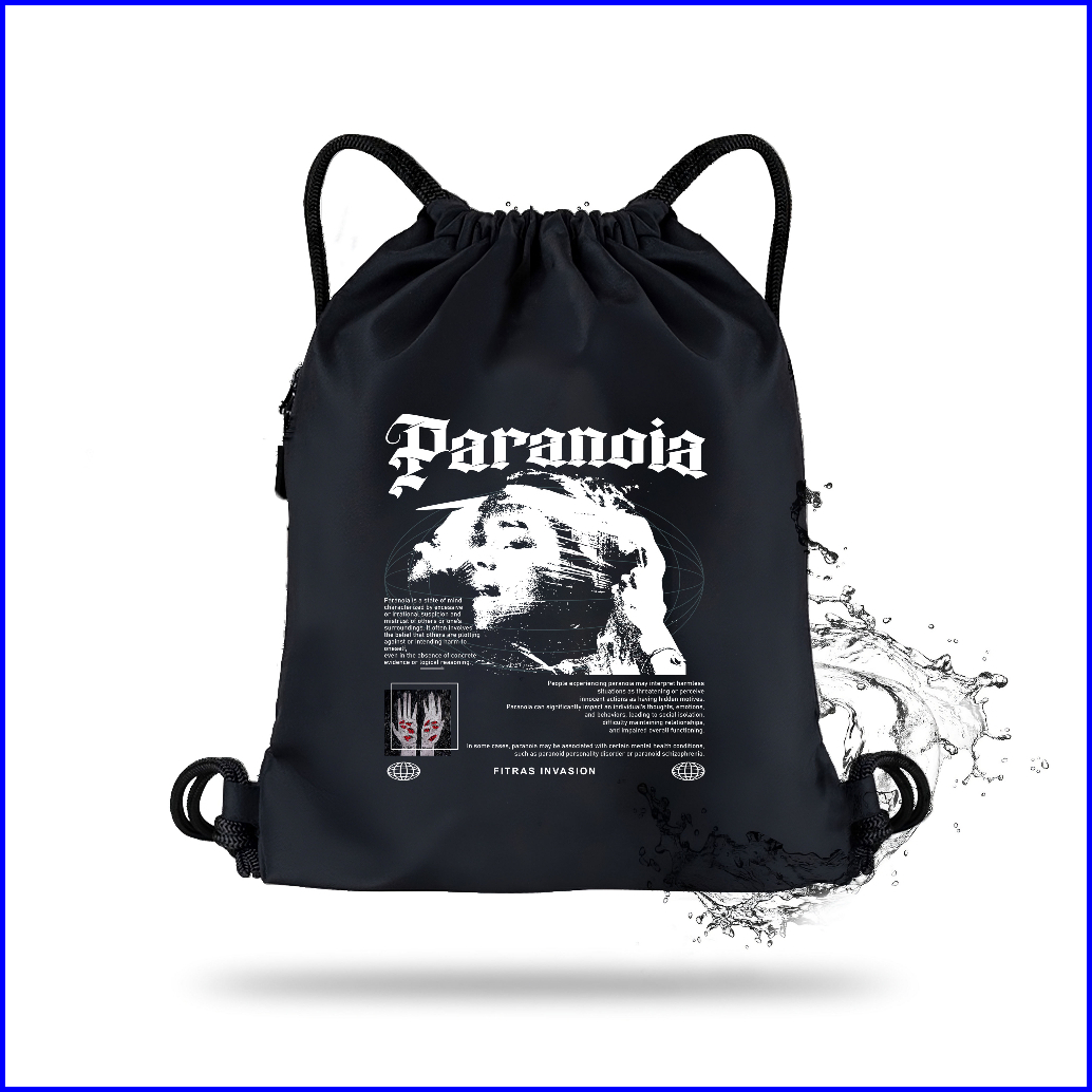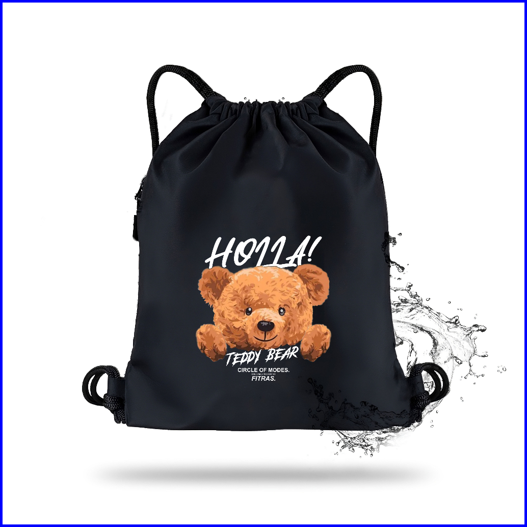 Fitras - Tas Serut Wanita Holla Teddy Bear Warna Hitam String Bag Bahan Cordura Kanvas Waterproff
