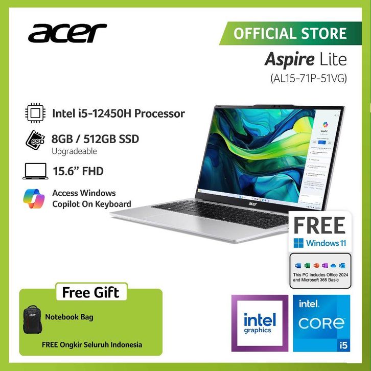 [Mall] (FREE MOUSE WIRELESS) ACER LAPTOP ASPIRE LITE AL15-71P-51VG 15.6" FHD INTEL CORE I5-12450H RAM 8GB STORAGE 512GB