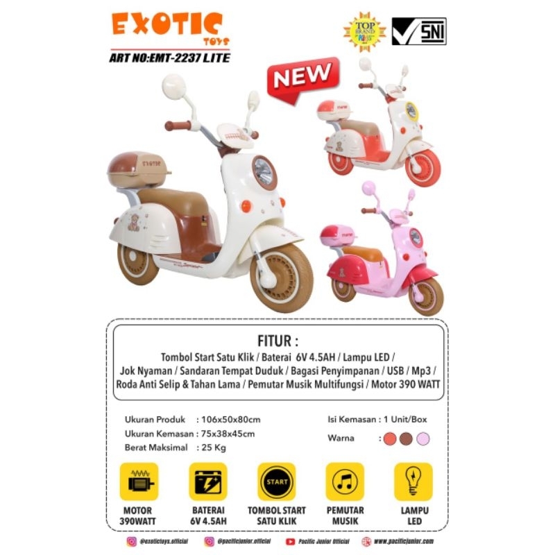 VESPA aki motor aki anak 2 sd 7tahun emt 2242 emt2237 emt-2222 6volt jok nyaman roda antislip dinamo usb lampu