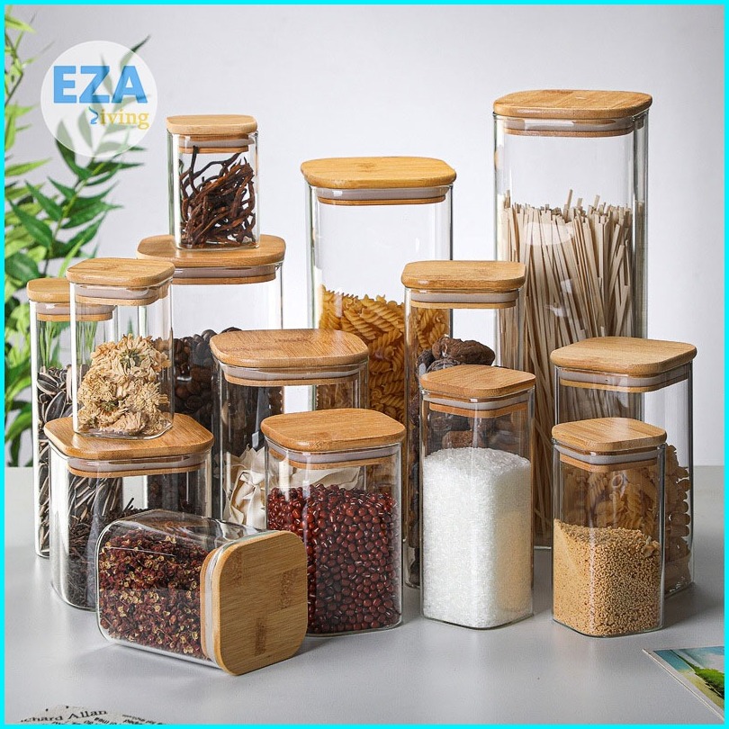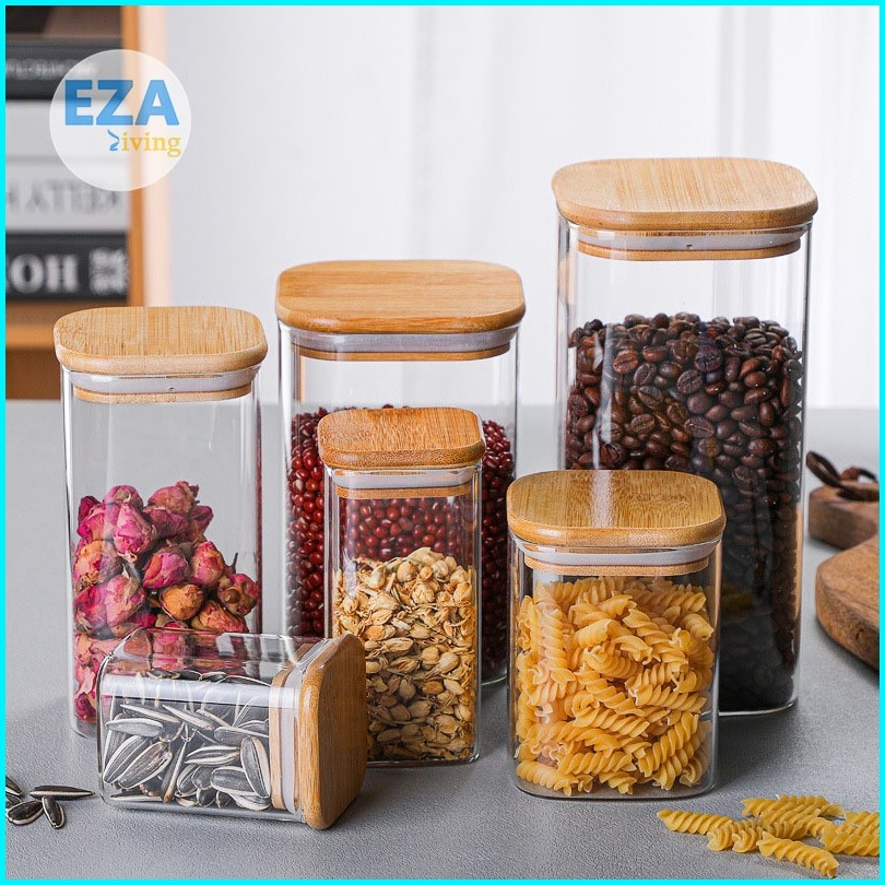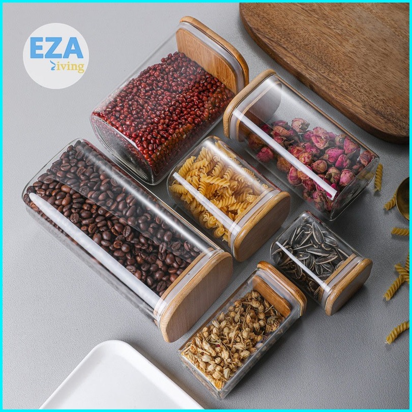 Toples Kaca Aesthetic Tutup Kayu Penyimpanan Makanan Bening Transparan Kedap Udara Anti Mlempem Desain Kotak Hc1019